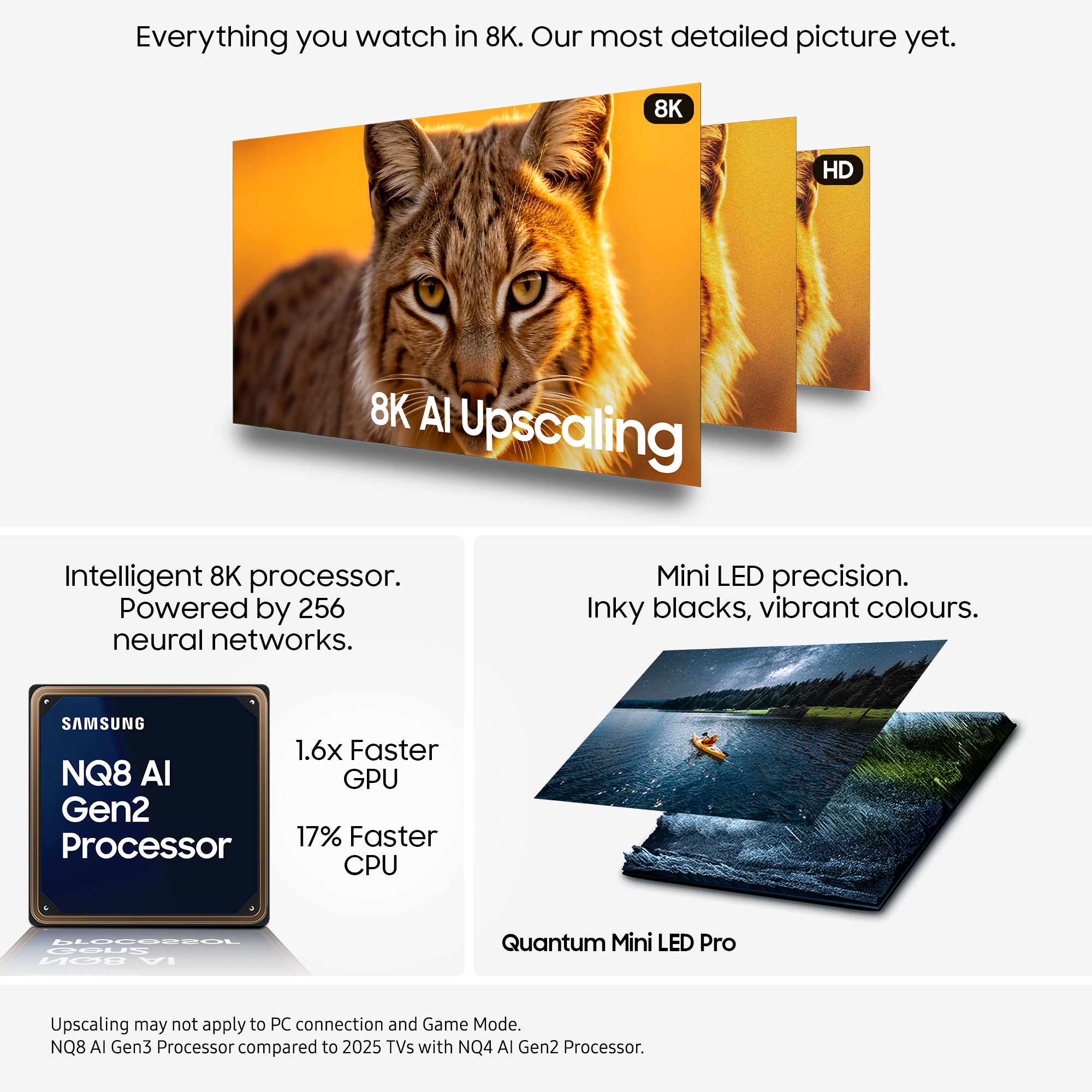 Experience intelligent enhancements to your entertainment and stunning 8K clarity - powered by 256 neural networks. Enjoy scene-by-scene upscaling to picture, brightness & contrast, plus motion, sound & resolution, for a superb visual and audio experience.