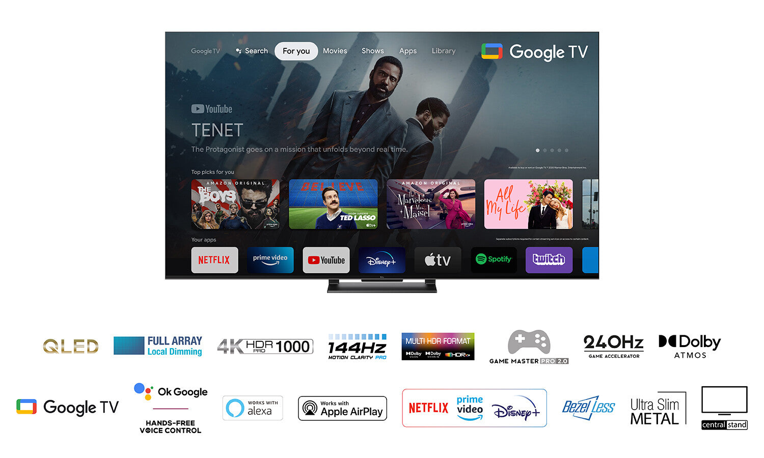 Smart TV applications Netflix, YouTube, Amazon Prime, AppleTV+, Google Play Store, TCL Home, Google Home, Apple Home Kit, Alexa Smart Home, Matter