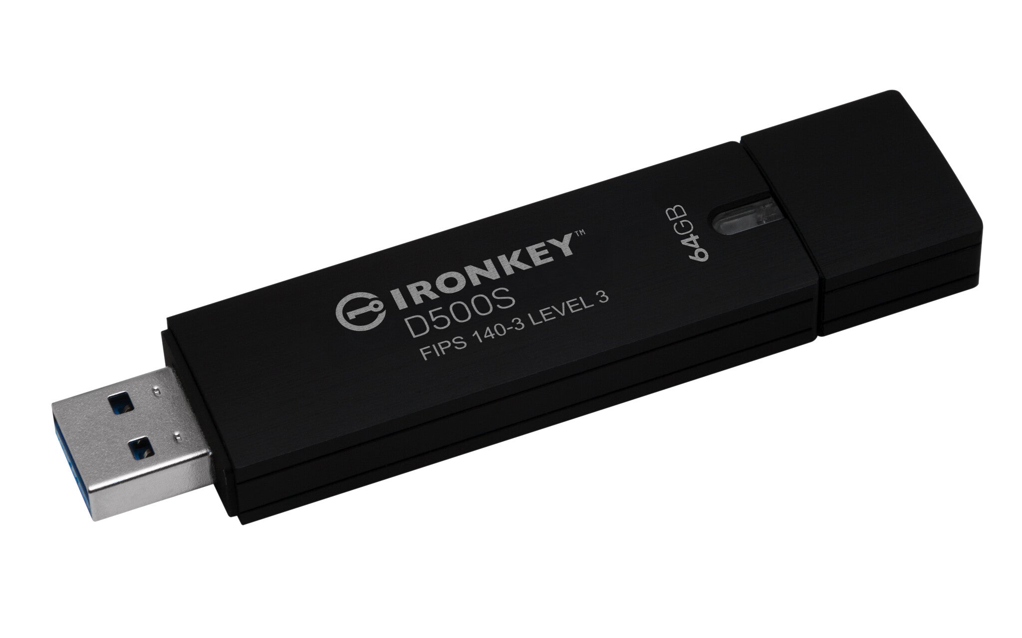 Kingston IronKey™ D500S best-in-class USB flash drive features military-grade and CMMC-compliant security to safeguard classified data. It is FIPS 140-3 Level 3 Validated with new enhancements from NIST for stronger security and attack protections. It features a rugged zinc casing that is waterproof*, dustproof*, shock and vibration resistant**, crush resistant and epoxy filled. Designed and assembled by Kingston in California, D500S is the world’s first FIPS 140-3 Level 3 Validated drive with a TAA-compliant trusted supply chain.