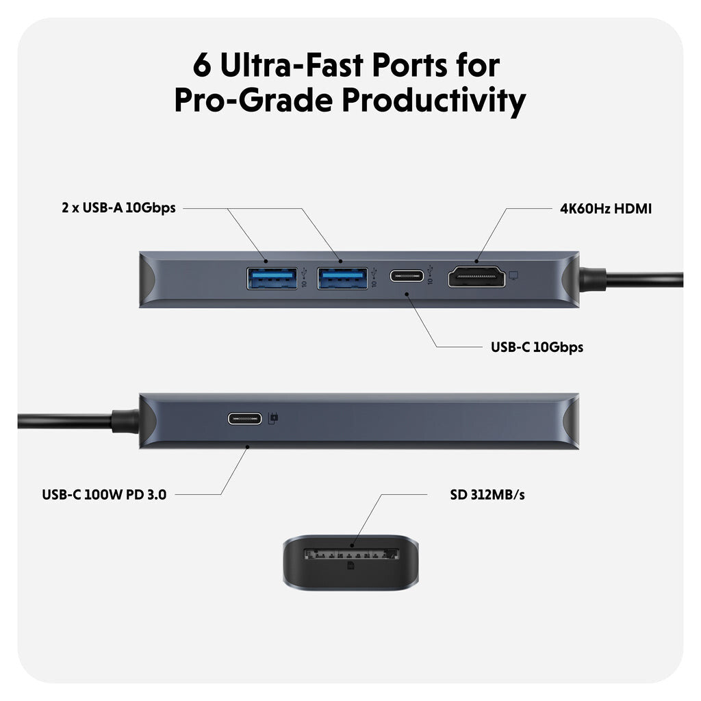 Introducing the HyperDrive® Next 6 Port USB-C Hub - the portable connectivity solution for creators, editors, photographers, and more. With extended 4K60Hz monitor support for Mac, PC, and Chromebook, 6 ultra-fast ports, and lightning-fast data transfers, unleash your creative potential anywhere. Experience 2X faster file transfers using the 10Gbps USB ports and 3X faster photo and video transfers with SD 4.0. Charge your device with a 100W PD power pass-through port and make a sustainable choice with EcoSmart™.
