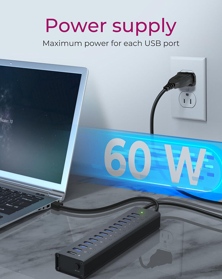 - ENERGY EFFICIENT: The 13 USB port 3.0 ports and the USB charging port have a common on/off switch to disconnect the peripheral devices. This is a simple way to save power