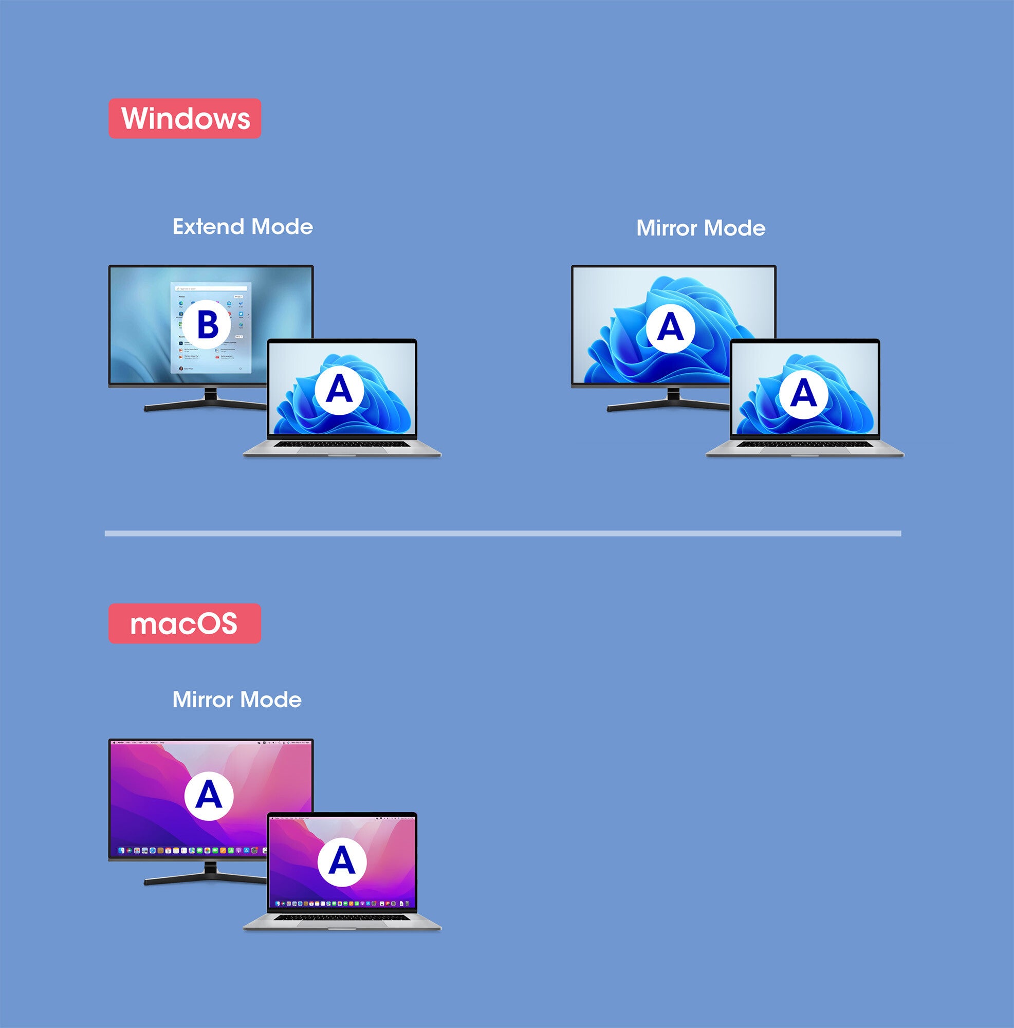 - Supports display modes Extended or Mirror on Windows®, and Mirror on Mac®