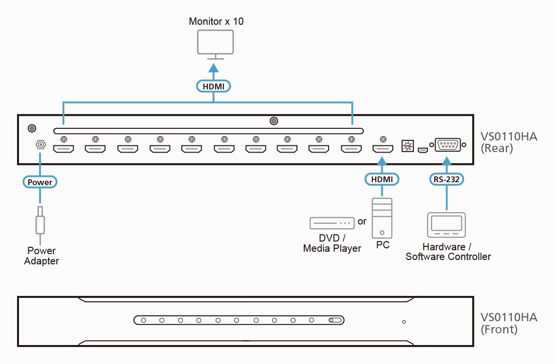 - Connects one HDMI source to up to ten HDMI displays at the same time