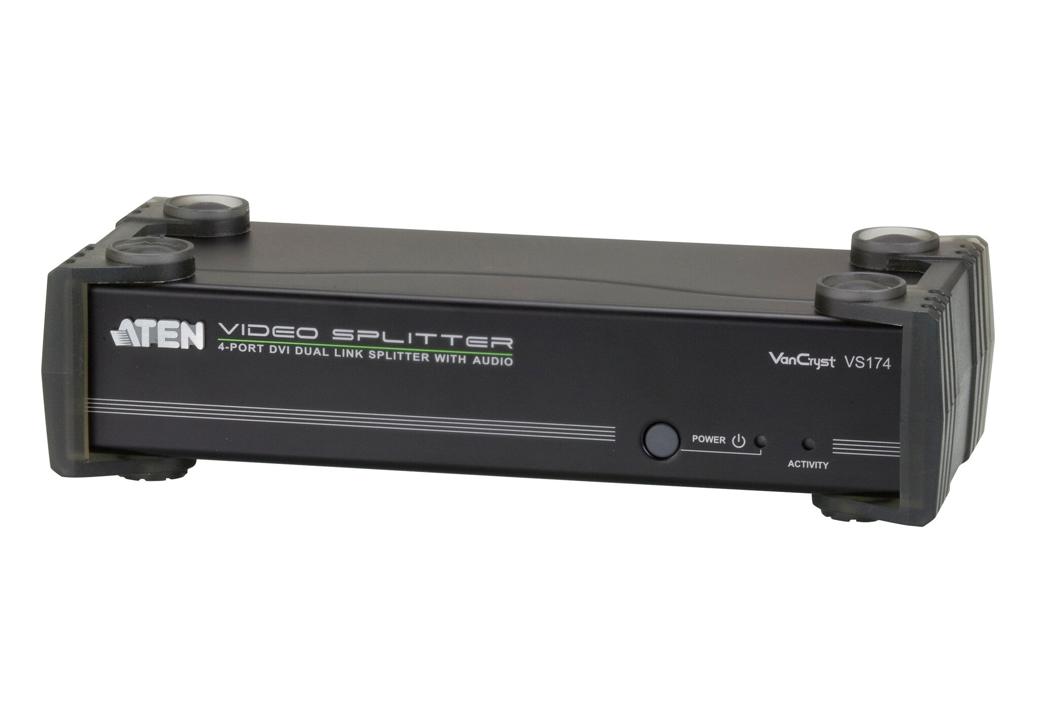 The VS174 4-Port DVI Dual Link Splitter with Audio combines DVI quality video and audio, taking signals from an audio/ video source and replicating them to four audio/video outputs. This video splitter uses dual link technology, which offers high bandwidth capacity for added transmission power and faster refresh rates, thereby providing better video quality of viewing resolutions up to 2560 x 1600.