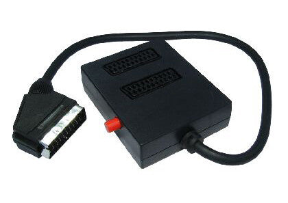 Two way SCART splitter box with switch for convenient switching between sources to reduce interference.