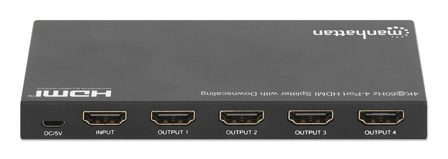 Manhattan HDMI Splitter with downscaling 4-Port , 4K@60Hz, Displays output from x1 HDMI source to x4 HD displays (same output to four displays), Downscale button to adjust a 4K input signal into 1080p, Micro-USB to USB-A power cable included (cable 0.8m),