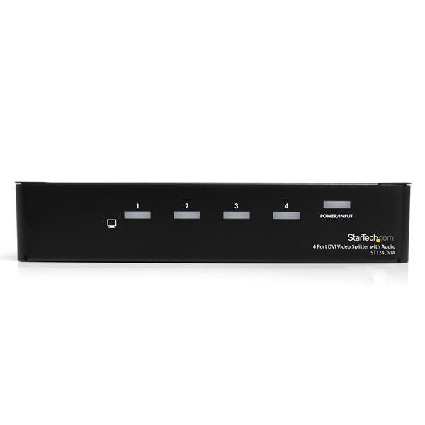 The ST124DVIA DVI splitter lets you share one DVI video and audio source on four displays and acts as a signal amplifier that allows you to locate your DVI monitors up to 33ft (10 m) away from your computer or DVI signal source.