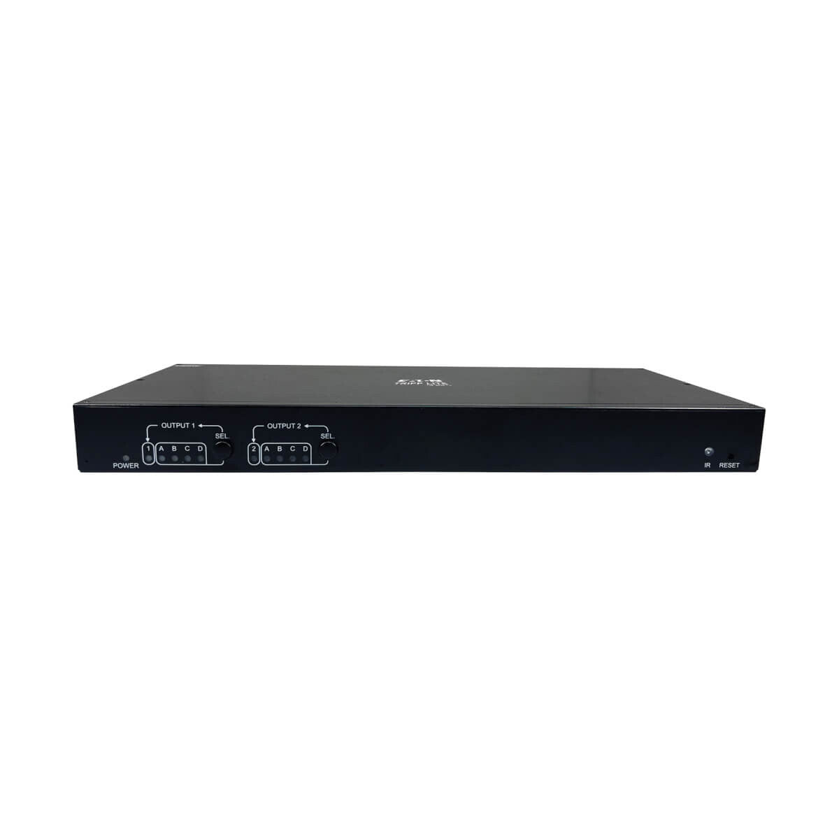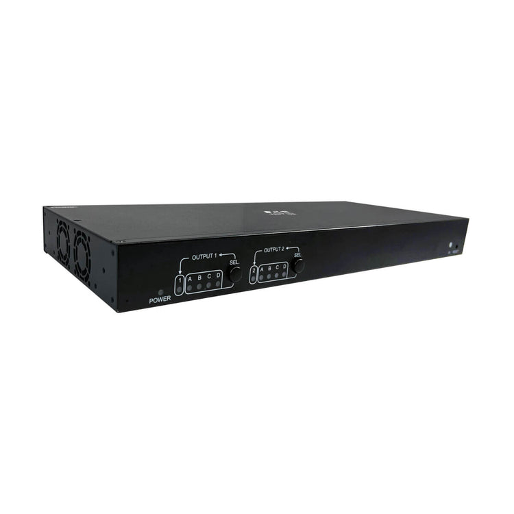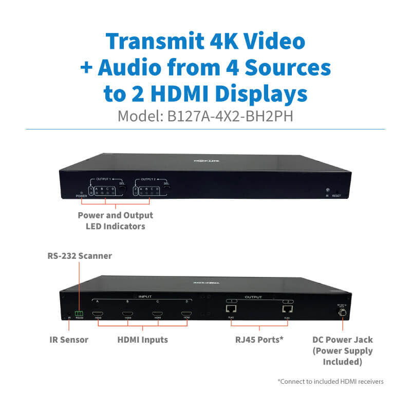 The B127A-4X2-BH2PH allows video from any of four connected HDMI sources to display on two HDMI displays up to 230 feet away via user-supplied Cat6 cabling. You may select which video to display on which monitors by using the push button on the switch or the included IR remote control, which lets you operate the switch from the receiver end of the installation. By installing B127A-010-H signal repeaters (sold separately) between the switch and receivers, you can extend the signal up to 400 feet (121.9 meters) total per video output.