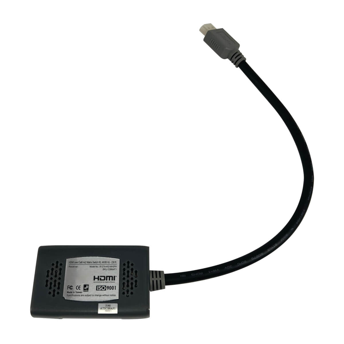 This HDMI matrix switch kit includes a quad-input switch and two pigtail-style receivers. It’s recommended for office buildings, schools, houses of worship, trade shows, meeting facilities, retail settings, hotels and other locations with video presentations or digital signage applications. The matrix switch and receivers extend 4K audio/video up to 230 feet (70.1 meters), making the kit ideal for areas where the four source devices and dual displays are farther apart than conventional cabling allows.
