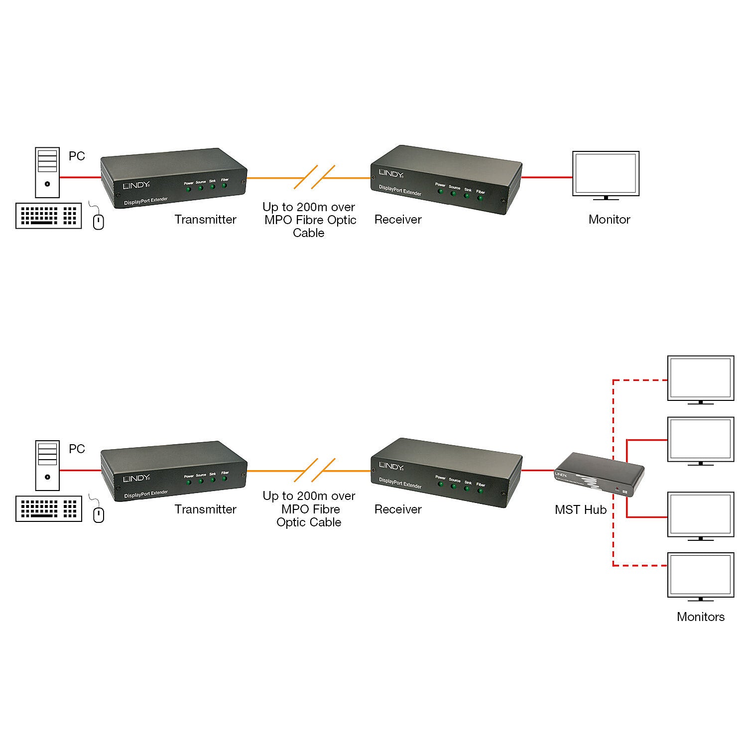 - Sends DisplayPort signals up to 200m using a single fibre optic cable