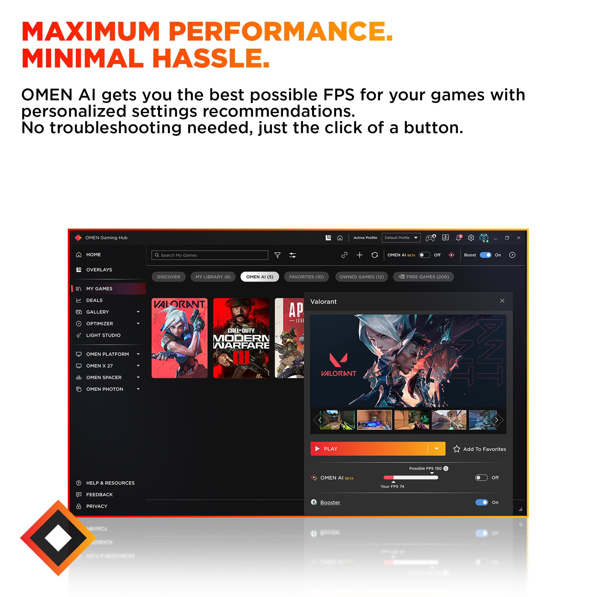 | HP Software provided | HP Connection Optimizer; HP Support Assistant; OMEN Gaming Hub; HP Enhanced Lighting |