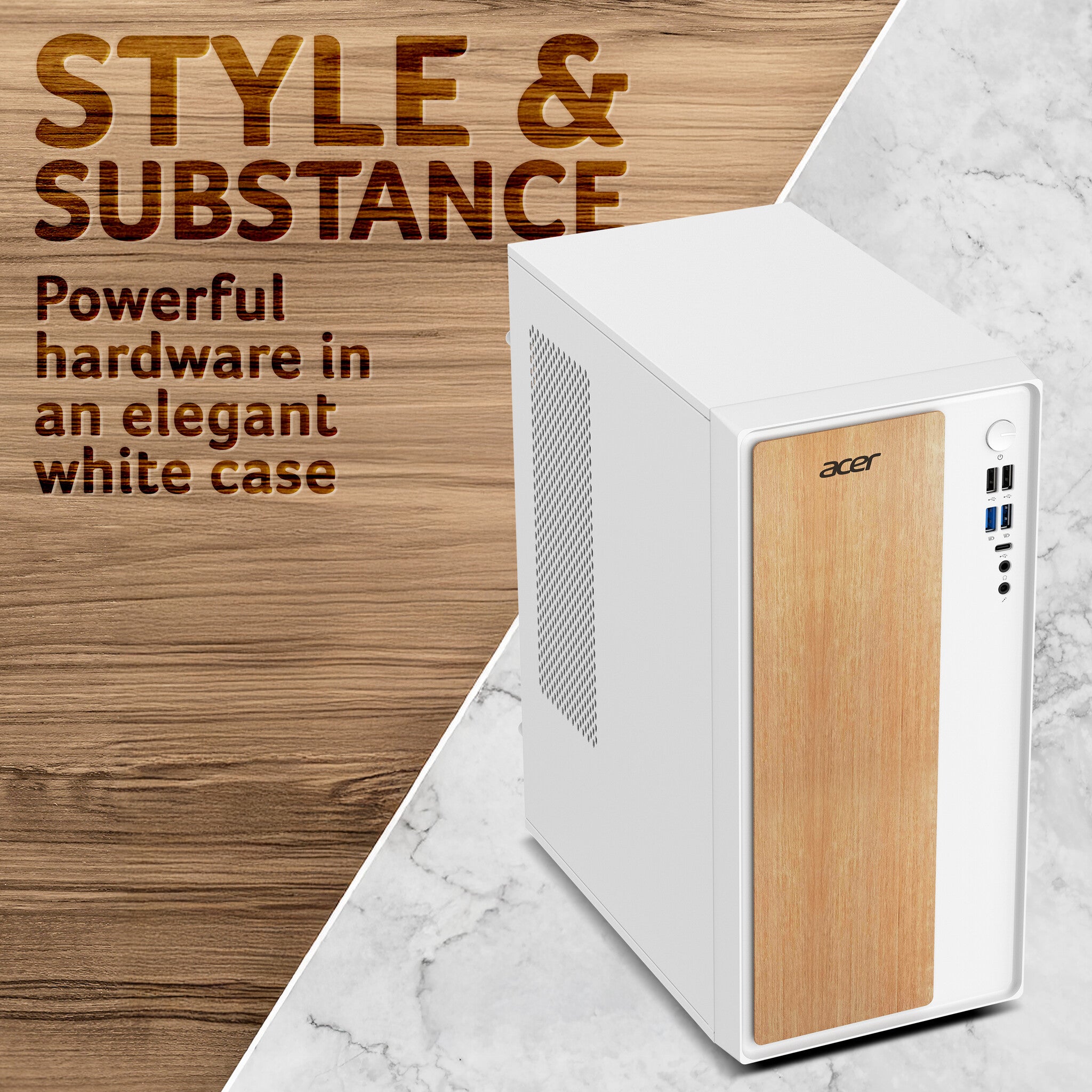 - Stylish white chassis with wood accent