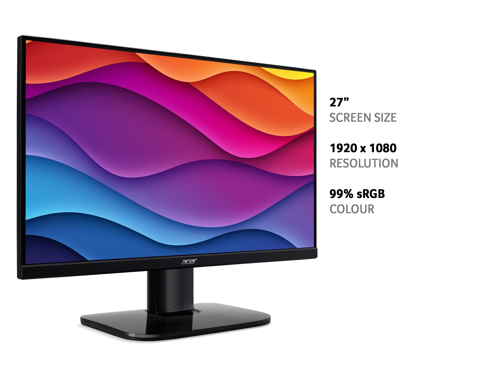 Elevate your viewing experience with the Acer KA272Ebi Monitor. Sized at a comfortable 27 inches, this monitor provides ample screen space to engage in work, entertainment, or gaming pursuits. With its Full HD (1920x1080) resolution, every image is rendered with striking clarity and fine detail, enhancing every visual whether it's a spreadsheet or a blockbuster movie.