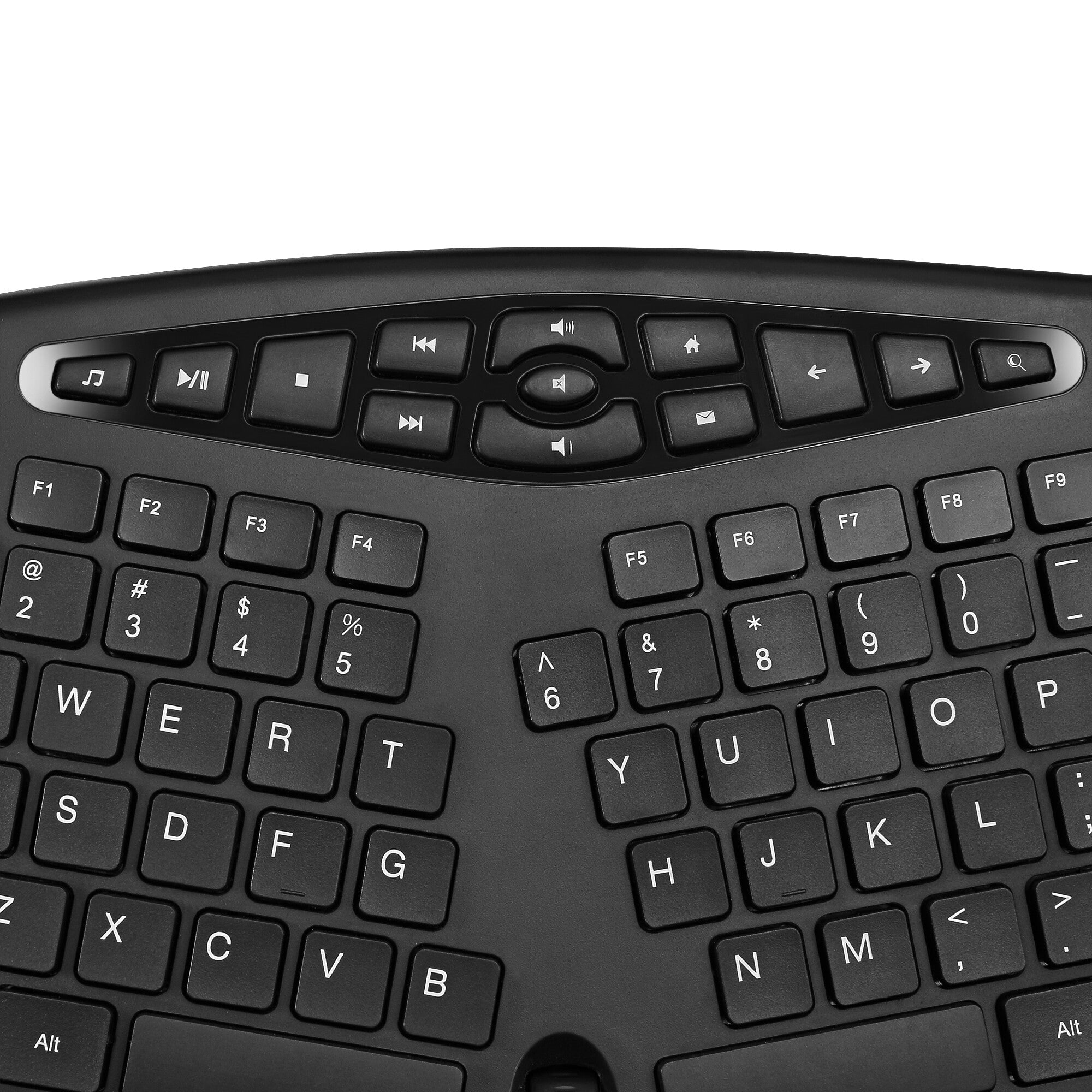 - Split Ergonomic Design The design of this keyboard with split key zones and gently sloped shape encourages natural position of hands, wrists, and forearm in maximum comfort for long use