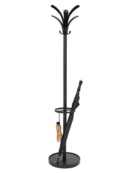 This coat stand comprises a rotating head with 6 plastic large coat pegs and three hooks, an umbrella holder, a water retainer and a metallic weighted base.
