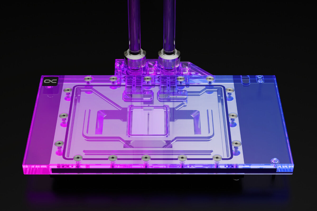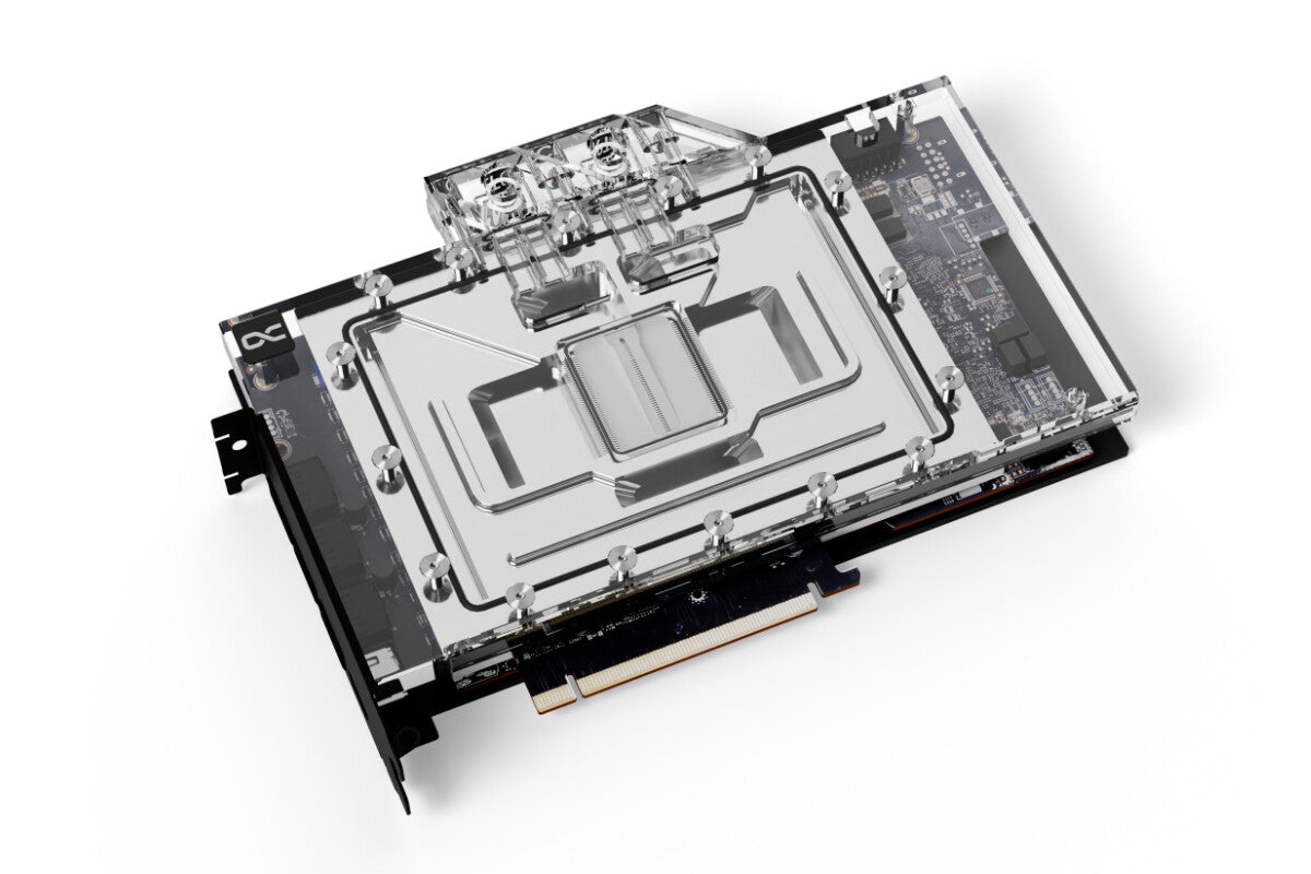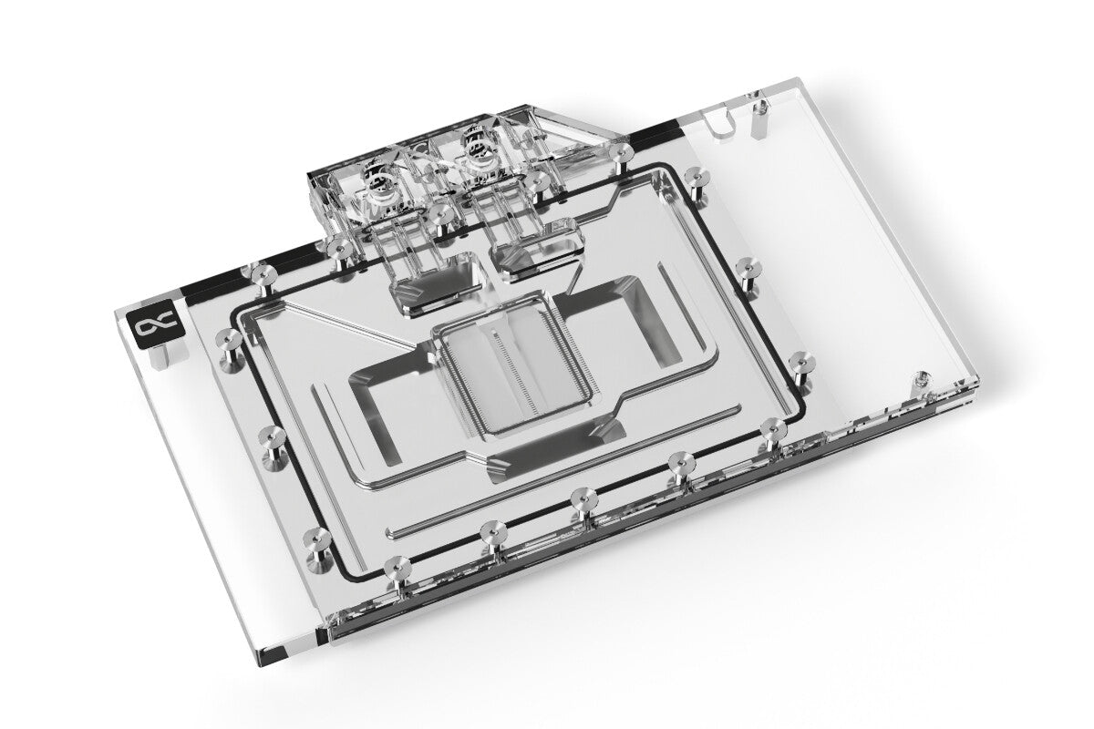 The next generation - the Alphacool Eisblock Aurora water cooler for Geforce RTX 40XX graphics cards. In order to dissipate the enormous heat of this graphics card generation in the best possible way, numerous optimizations have been made to the water cooler compared to the previous model. The fin structure was adapted and enables a very good water flow while increasing the cooling surface. The modified jet plate with improved inflow engine ensures an optimal distribution of the water on the cooling fins.
