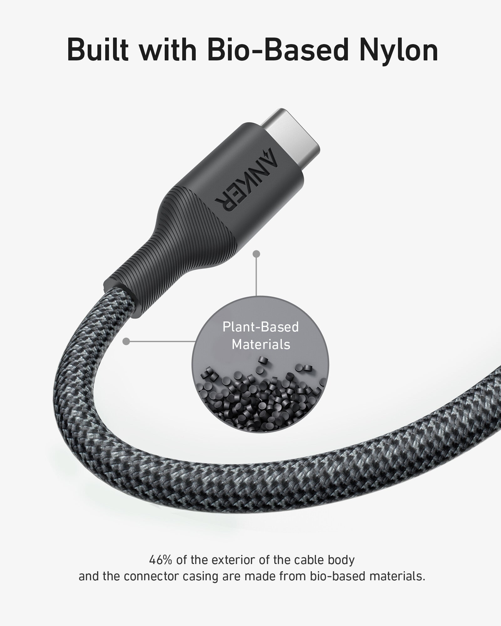 • Built with Bio-Based Nylon: 46% of the cable body exterior is made from bio-based nylon, while 34% of the connector casing is made using other bio-based materials. Using bio-based materials in our cables allows us to cut down on petroleum-based plastic such as TPE