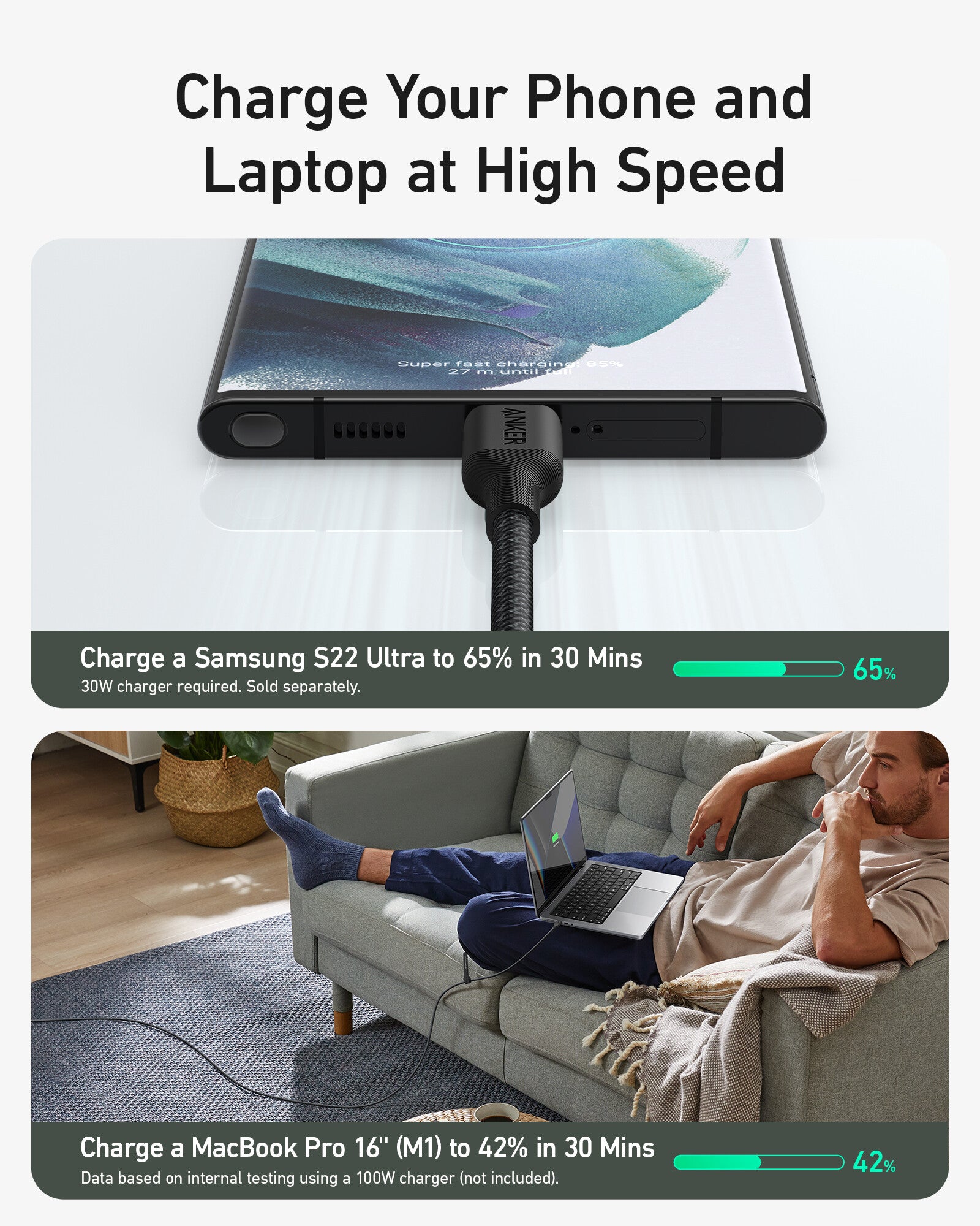• Fast Charging: Charge a Samsung Galaxy S22 Ultra to 65% in just 30 minutes