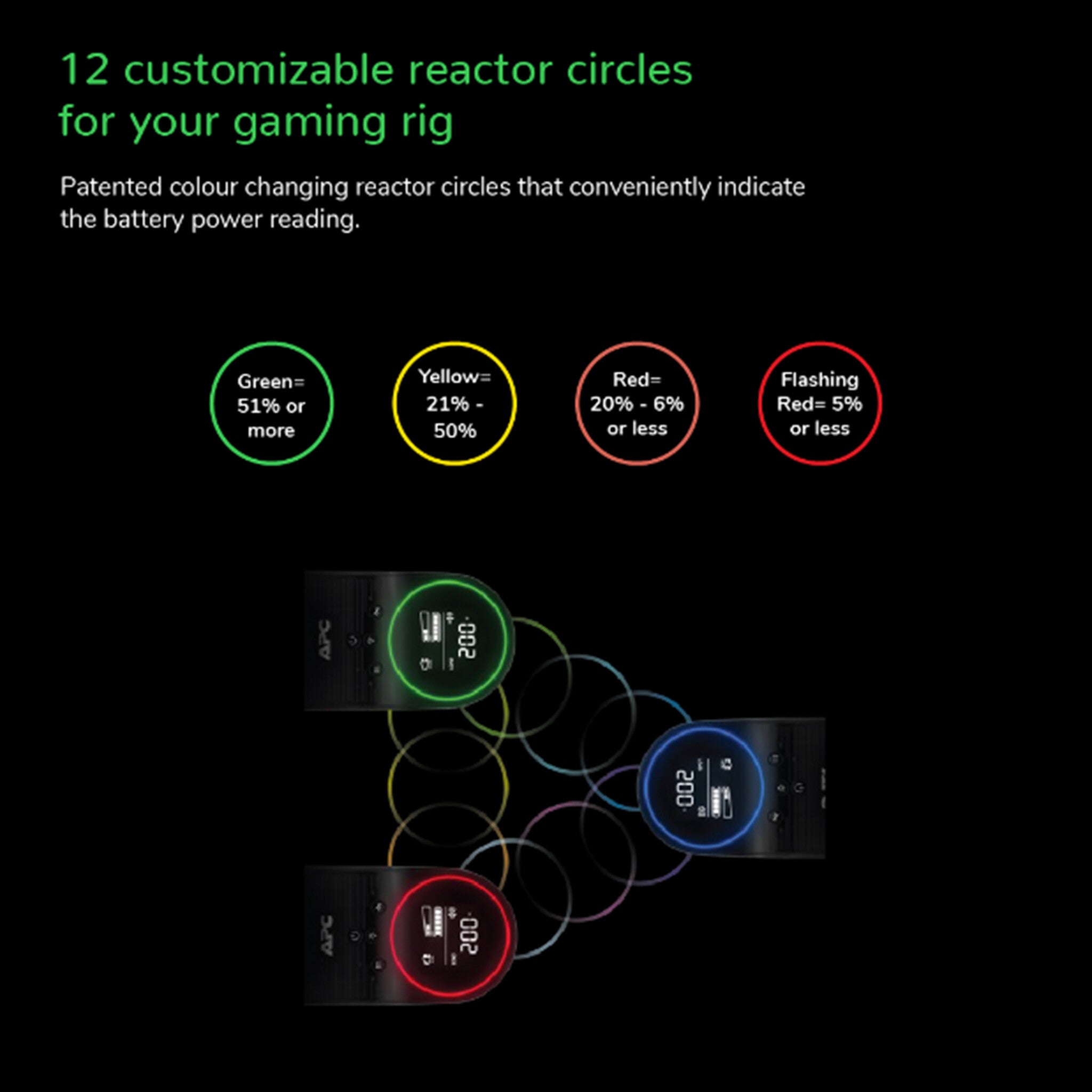 The APC Gaming UPS is equipped with LEDs on the back that illuminate the sockets, so you can see exactly where you connect your gaming equipment. The rear LED colors in sync with the reactor circle and provides an atmospheric glow behind your gaming setup.