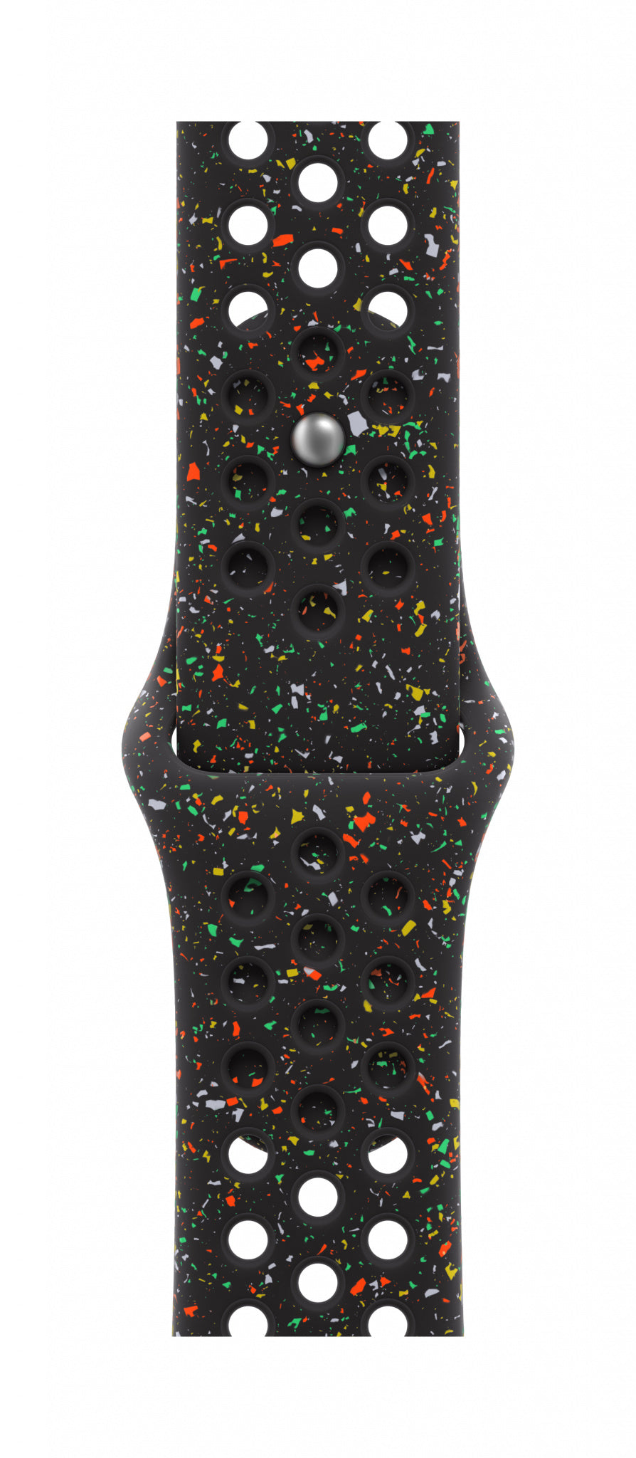 Made with compression-moulded perforations for breathability, the Nike Sport Band is durable and strong, yet surprisingly soft. It features colourful flakes that create a randomised pattern, making each strap unique. The smooth, dense material drapes elegantly across your wrist and feels comfortable next to your skin. An aluminium pin-and-tuck closure — carefully etched with the Run Swoosh logo — gives the pin a fresh matt finish.