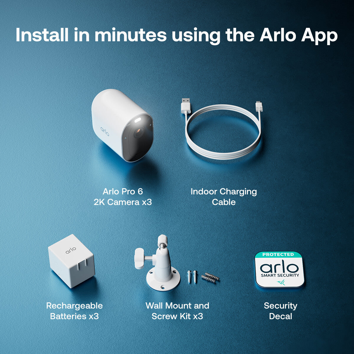 | Packaging content | (3) Arlo Pro 6 2K Camera, (3) Rechargeable Battery, (1) Indoor Charging Cable, (3) Wall Mount and Screw Kit, (1) Quick Start Guide, (1) Security Decal |