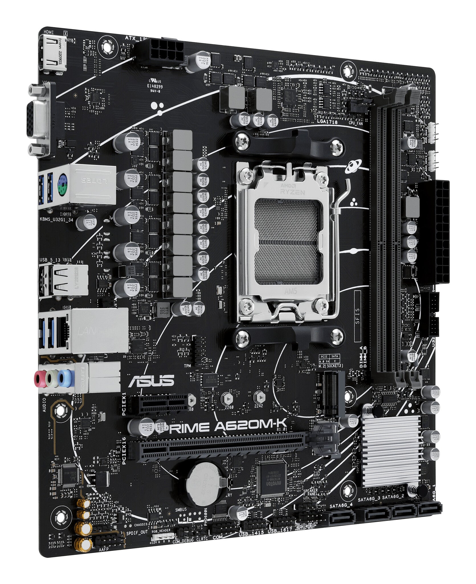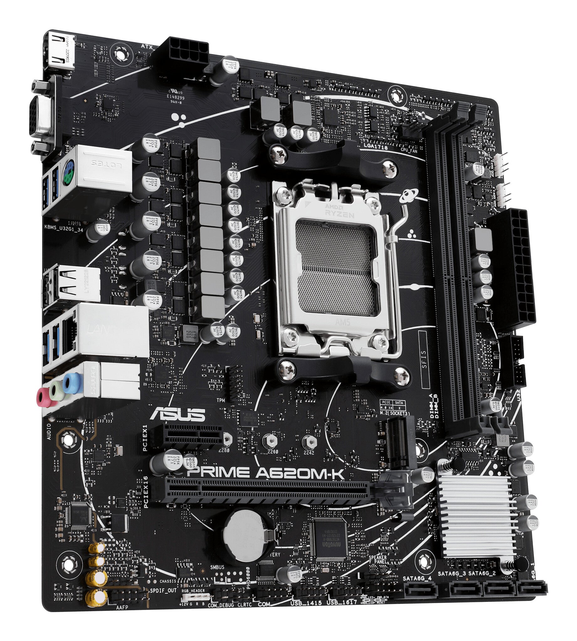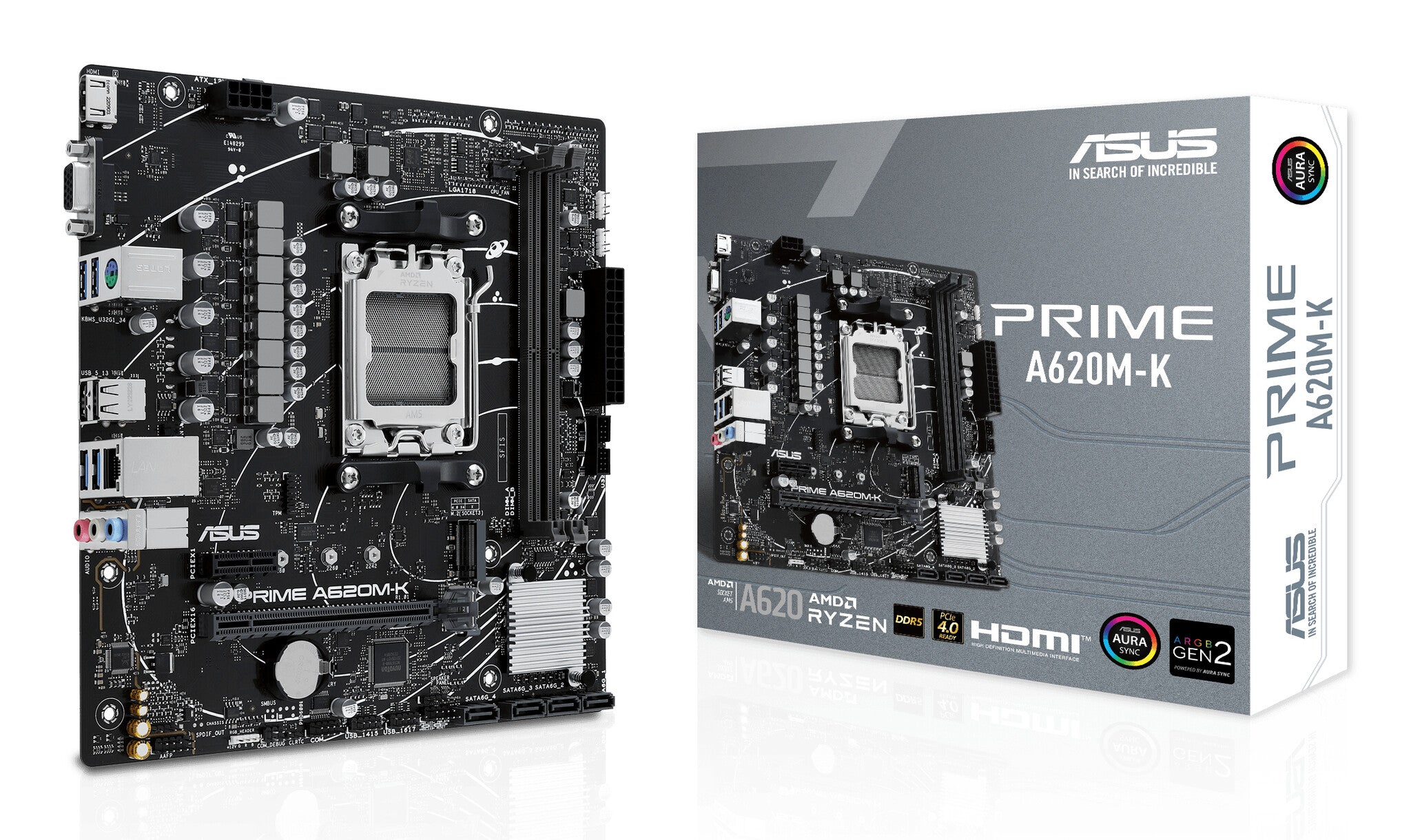 AMD A620 micro-ATX motherboard, DDR5, PCIe 4.0 Graphics card and PCIe 4.0 M.2 support, HDMI™, VGA, USB 3.2 Gen 1 Type-A, SATA 6 Gbps, Two-Way AI Noise Cancelation, Aura Sync