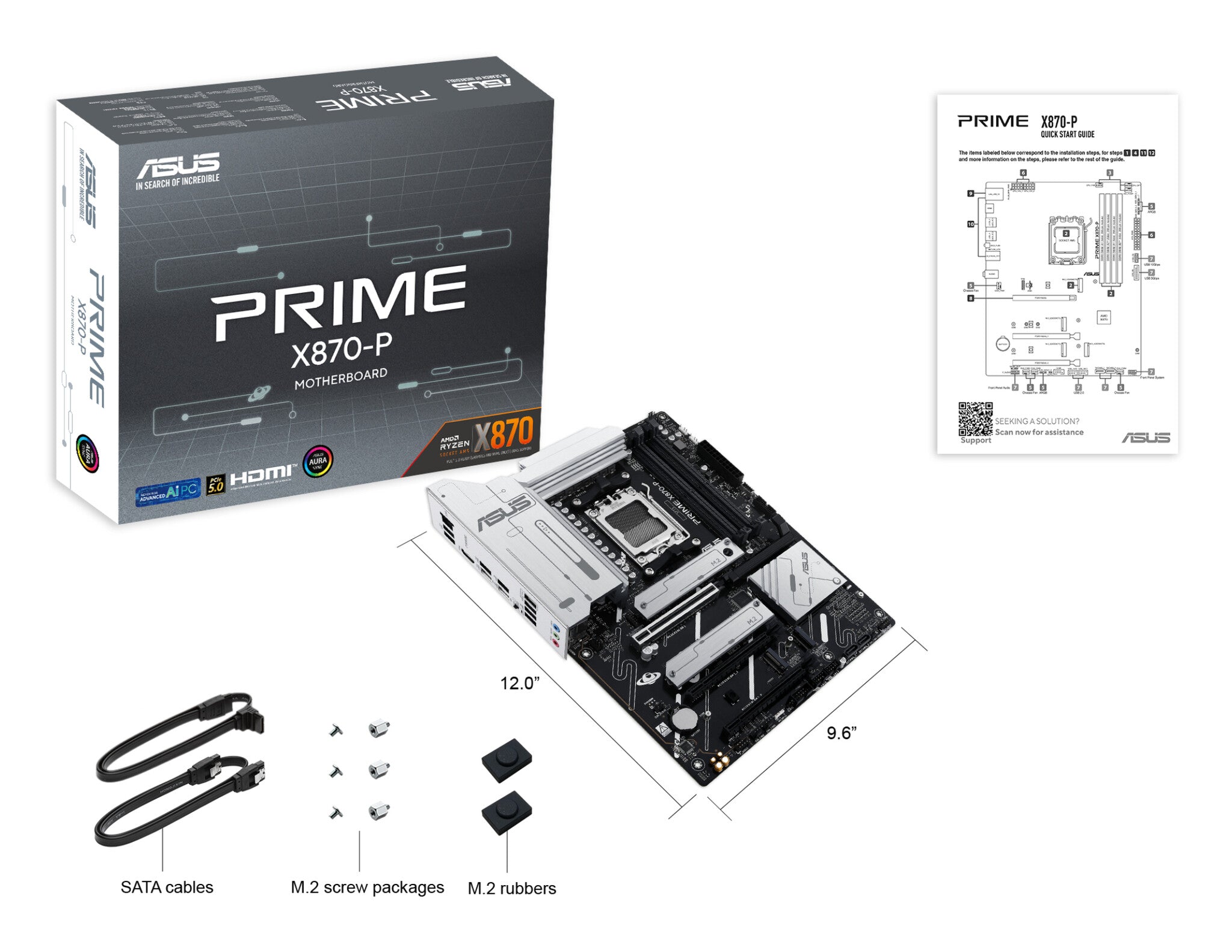 ASUS Prime series motherboards are expertly engineered to unleash the full potential of AMD Ryzen™ 9000 series processors. Boasting a robust power design, comprehensive cooling solutions and intelligent tuning options, the PRIME X870-P motherboard provides users and PC DIY builders with a range of performance optimizations via intuitive software and firmware features. It's designed to be Advanced AI PC-ready, offering the power and connectivity needed for demanding AI applications.