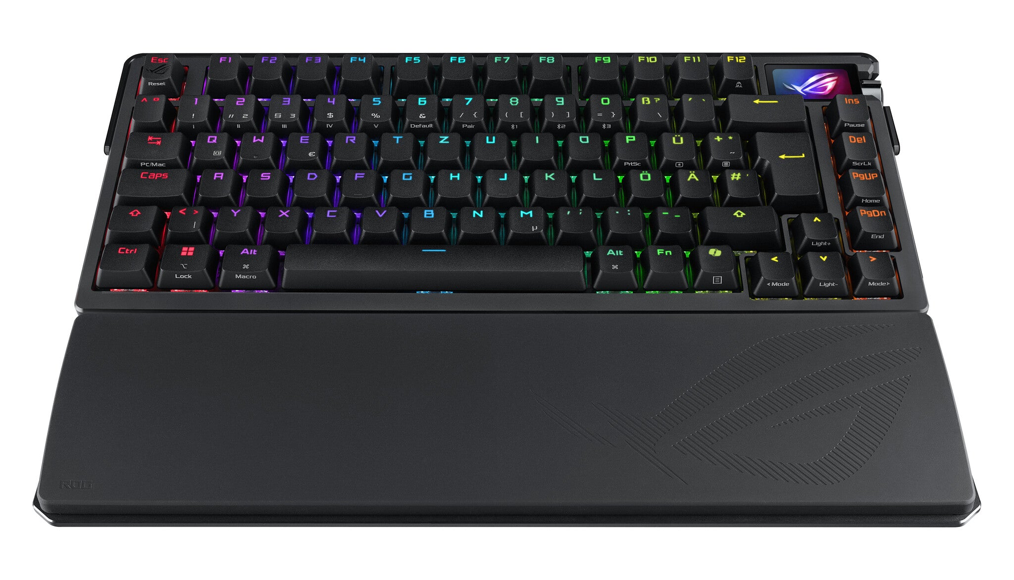 The ROG Azoth Extreme is a customizable 75% gaming keyboard with a premium aluminum-alloy chassis and metal frame. It features an 8000 Hz report rate with the ROG Polling Rate Booster and over 1600 hours of battery life in ROG SpeedNova 2.4 GHz wireless mode. The upgraded OLED touchscreen and three-way knob enable system monitoring and quick adjustments. The carbon-fiber positioning plate ensures a crisp typing sound, while three dampening layers absorb vibrations. An adjustable gasket mount with a paddle switch offers two typing preferences.