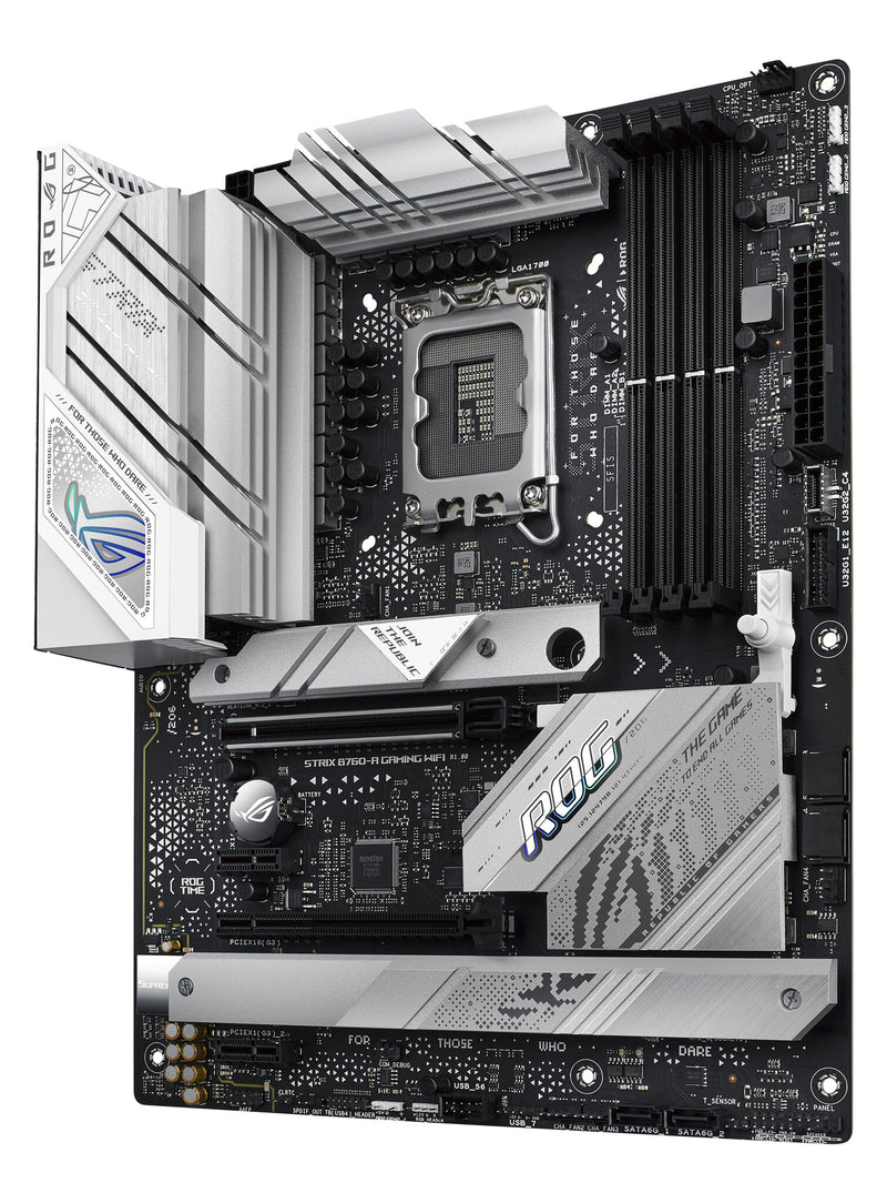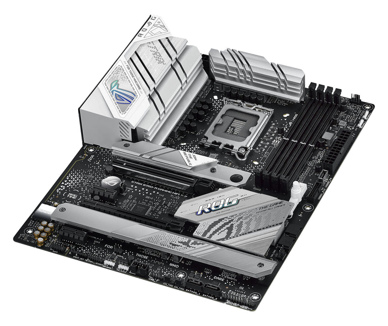 Diagonal slats, brushed aluminum, and bold RGB have become hallmarks of the ROG aesthetic, and the Strix B760-A bears all of them with pride. Its white, silver, and black color scheme pairs well with both dark and lighter-colored components. 8-bit accents show some gaming pride.