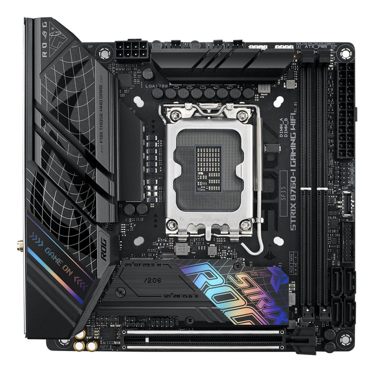 The black shrouds and PCB of the Strix B760-I pair well with most products from the diverse ROG ecosystem, all while making your build distinct with a dash of polychromatic contrast.