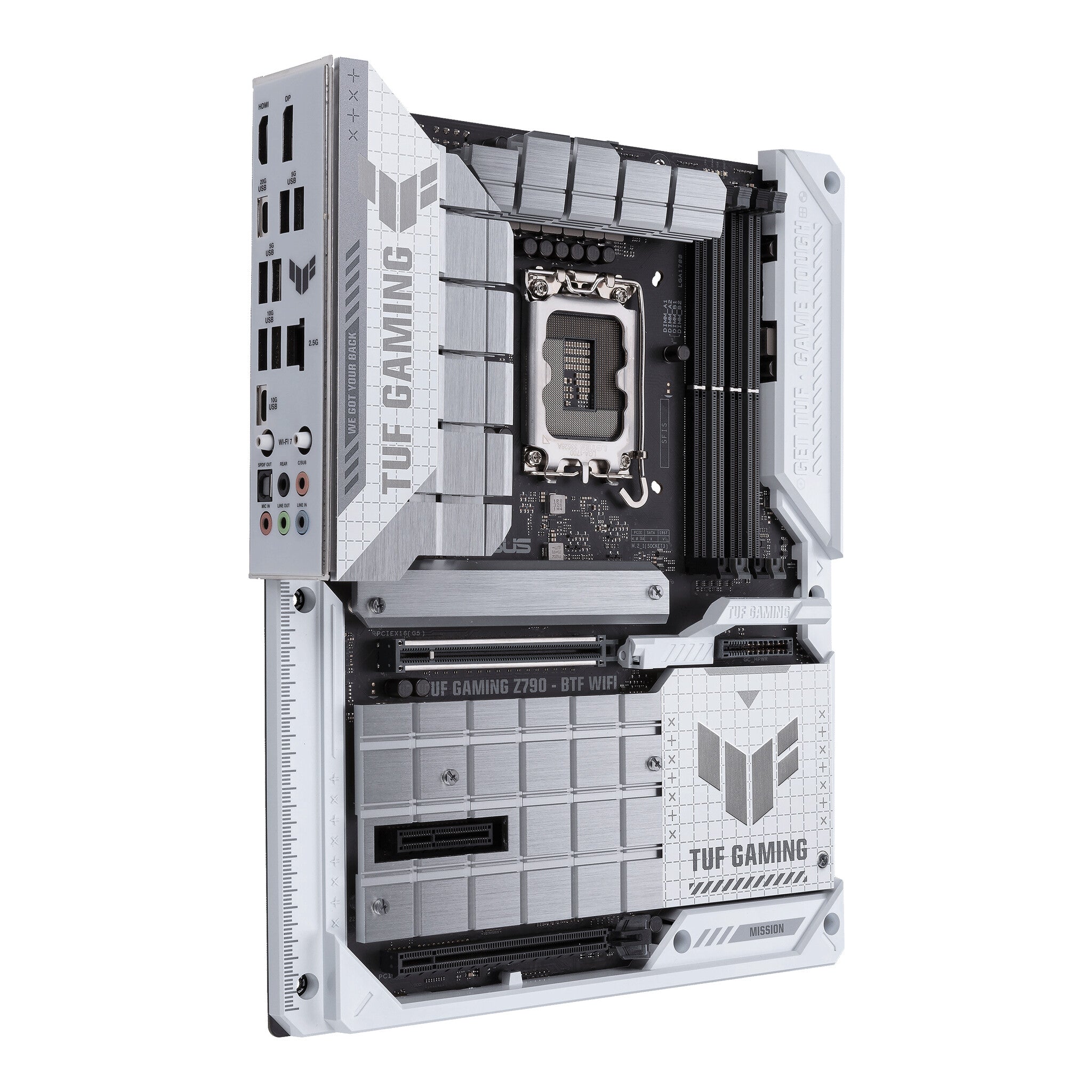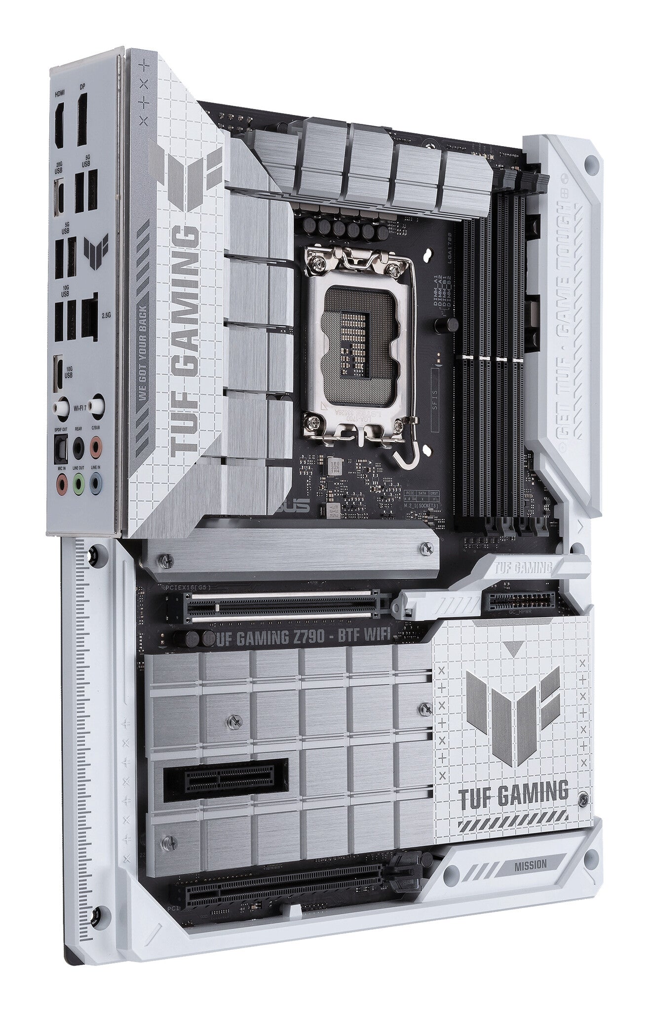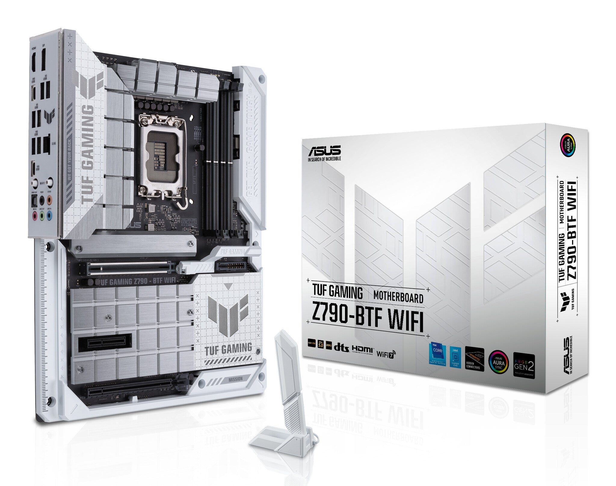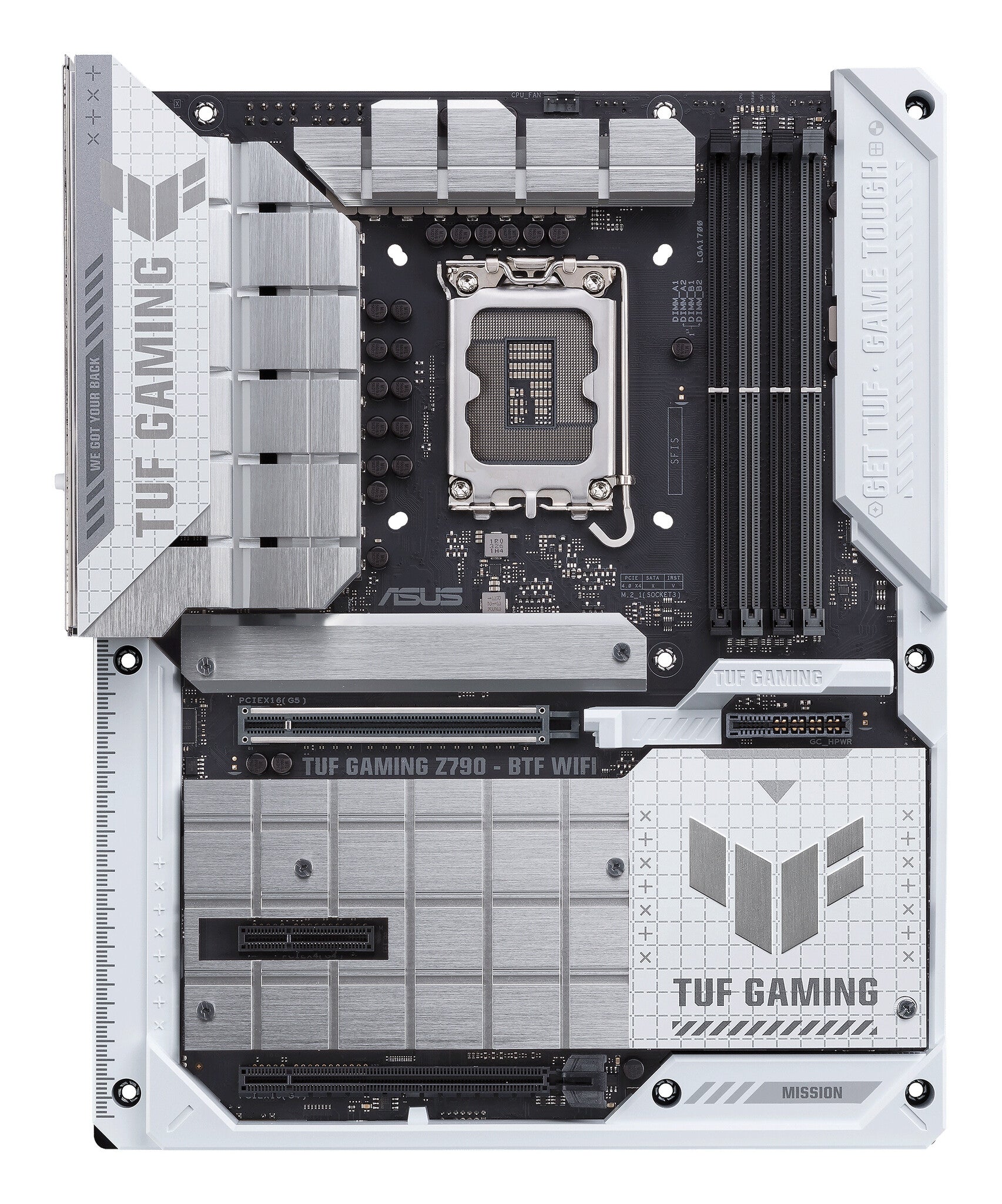 TUF GAMING Z790-BTF WIFI takes all the essential elements of the latest Intel® processors and combines them with game-ready features and proven durability. “BTF” means “Back To (the) Future” for a new era for all PC DIY gamers; the advanced BTF series not only hides all its connectors on the underside of the motherboard, but it also delivers up to 600 watts for BTF graphics cards through a graphics card high-power slot, for clean cable management and a minimalist build appearance.