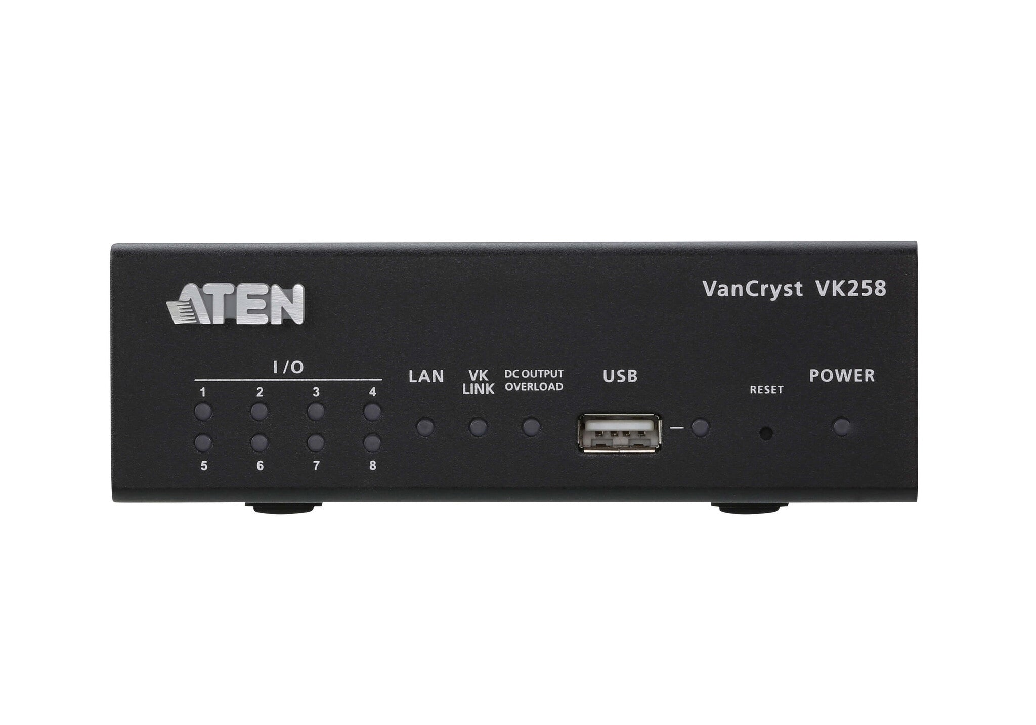 The VK258 8-Channel Digital I/O Expansion Box provides an additional eight channels of digital input/output for a flexible expansion of the ATEN Control System. This allows users to control more digital I/O devices, such as various sensors, dry contact devices, PCs, and motor-driven devices in environments where more devices need to be centrally controlled. With the advantage of the Ethernet-based connection, the expansion box easily connects to the ATEN Controller via a LAN connection from different locations across a network.