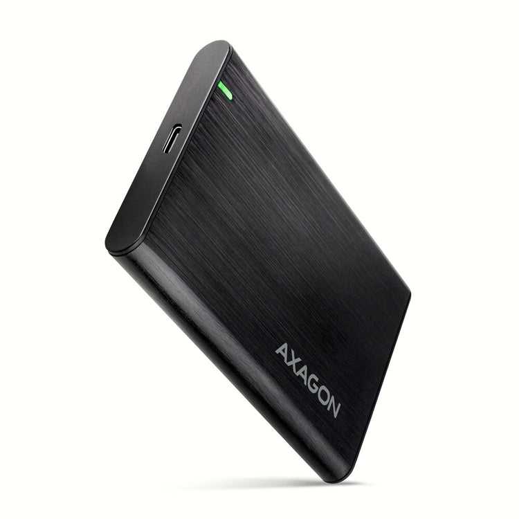 Screwless aluminum external AXAGON EE25-A6C RAW box with USB 3.2 Gen 1 (USB 3.0) interface is designed for 2.5" SATA hard drives or SSDs. The double-sided USB-C connector on the box together with the supplied USB-C -> USB-A cable enables a reliable connection to a computer.