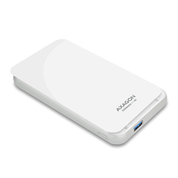 The universal plastic AXAGON EE25-S6 SCREWLESS WHITE external box with USB 3.0 and SATA 6G interface designed for 2.5" SATA hard disks or SSDs.