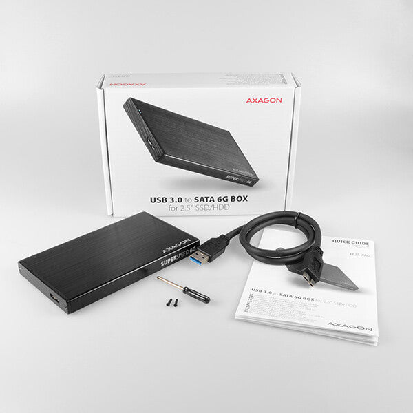 The compact aluminium AXAGON EE25-XA6 ALINE external box with USB 3.2 Gen 1 (USB 3.0) interface designed for 2.5" SATA hard disks or SSDs.