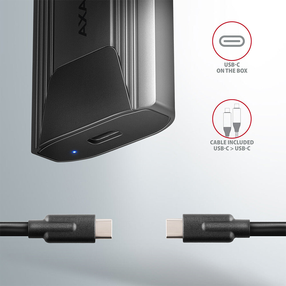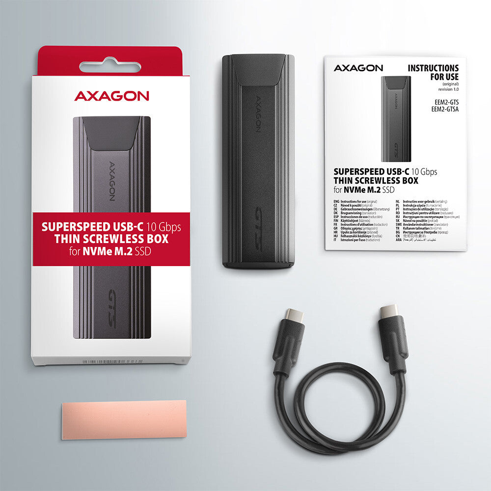 Superfast external AXAGON EEM2-GTS THIN SCREWLESS box with USB 3.2 Gen 2 interface is designed for NVMe (PCI-Express) M.2 SSD disks. The double-sided USB-C connector on the box together with the supplied USB-C <-> USB-C cable enables a reliable connection to a computer.