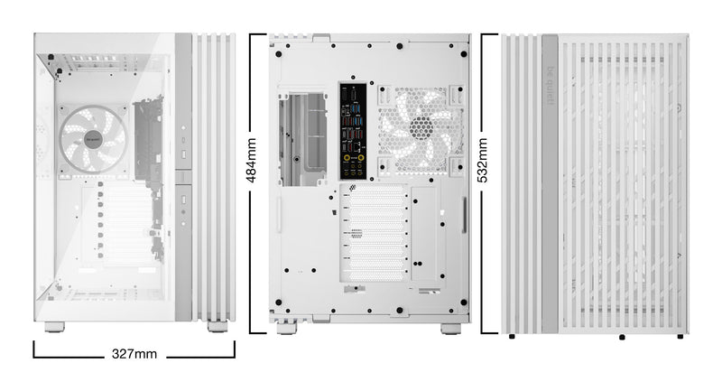 Light Base 900 FX White comes with 4 pre-installed Light Wings fans. One fan is installed as rear exhaust, 3 Light Wings 140mm PWM White fans with reversed fan blades are pre-installed on the side mounting. The reverse fans make sure your system is still an eye-catcher when installed as a side intake. Their 7 airflow-optimized fan blades not only reduce noise-generating turbulences but also ensure that this fan provides the performance that is needed, even in demanding configurations.