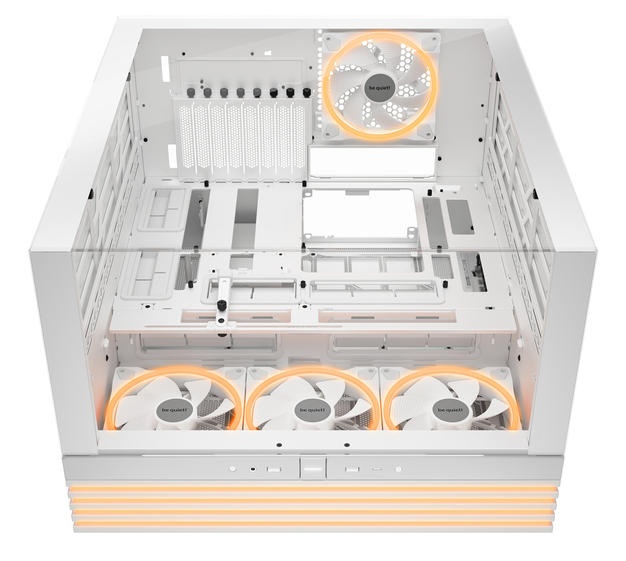 The 4 pre-installed fans can be expanded to up to 10 in total, making Light Base 900 FX White extremely versatile. With its extra spacious design, it can hold up to two 420mm radiators simultaneously, an E-ATX motherboard and even the most powerful graphics cards. Thanks to the two-chamber design, drives and cables are neatly tucked in the back and do not get in the