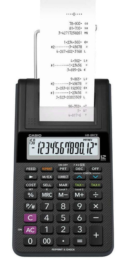 The HR-8RCE is a hand held 12 digit display Printing Calculator. Features include Percentage calculation, tax and currency calculations with a Printing speed of 2.0 lines per second. An additional feature is “Cost Sell, Margin. The Paper width is 58 mm Battery operation (4 x AA) + an optional mains adaptor.