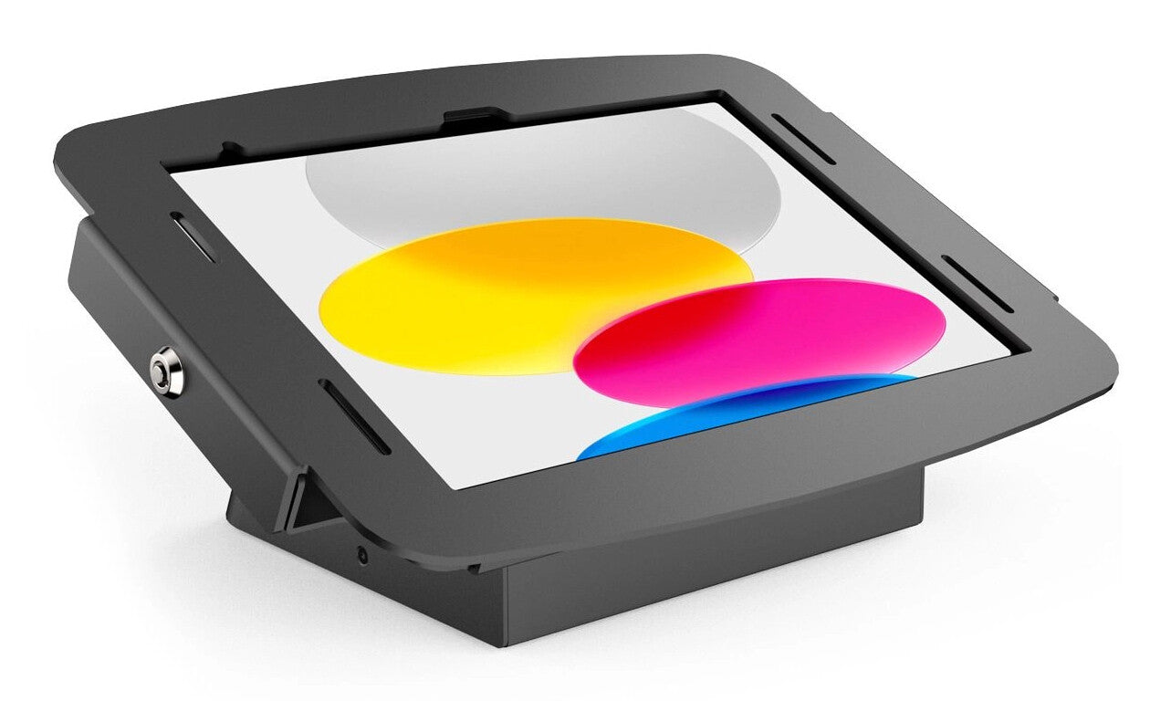 The Space iPad Enclosure features rounded edges and open corners for improved tablet ventilation and allows for limited access to buttons and inputs. It has a Quick-Lock / Unlock keyed lock for extra safety.