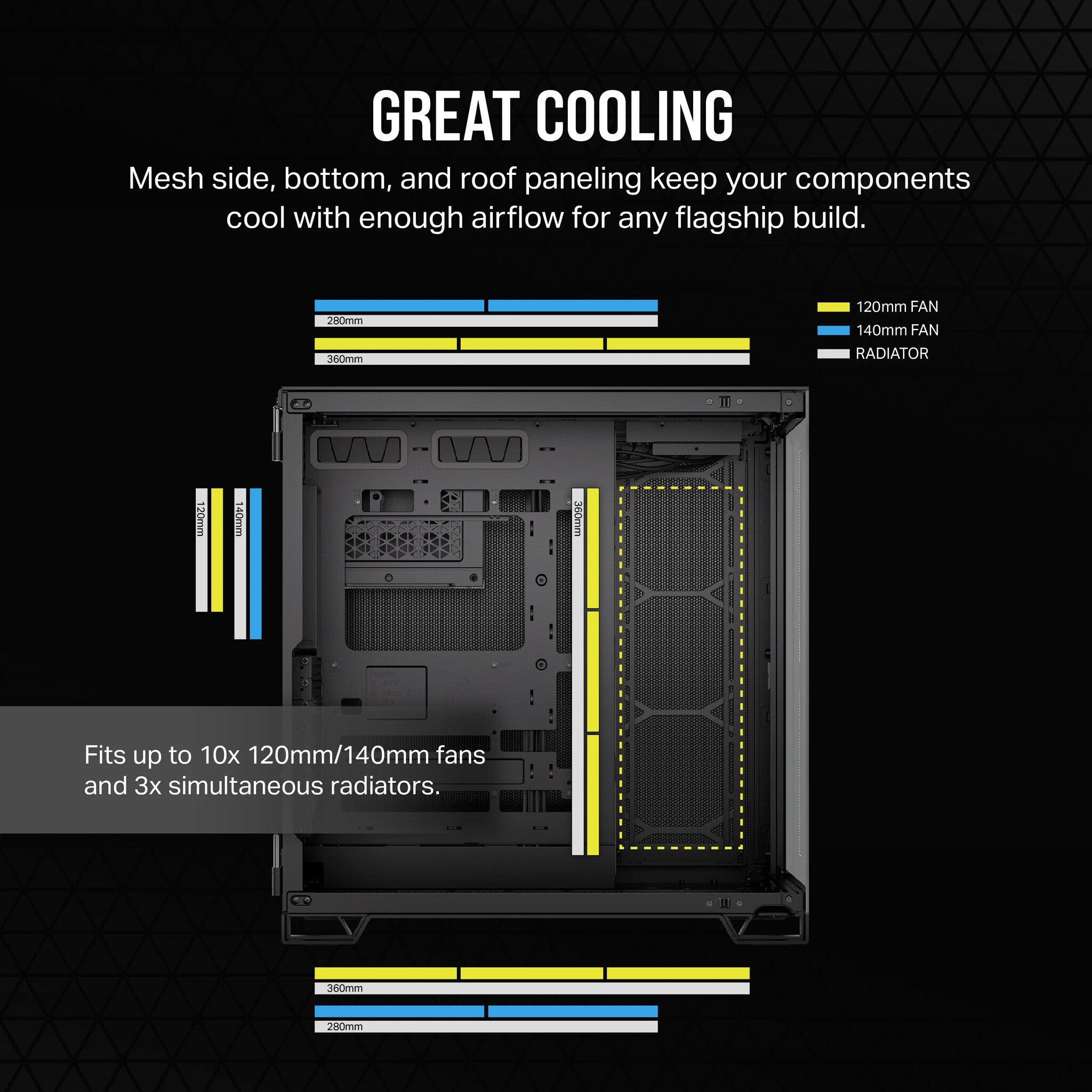 The CORSAIR 6500D AIRFLOW Mid-Tower Dual Chamber PC Case delivers exceptional airflow and cooling with fully mesh paneling and a dual chamber design for an organized, stunning build.