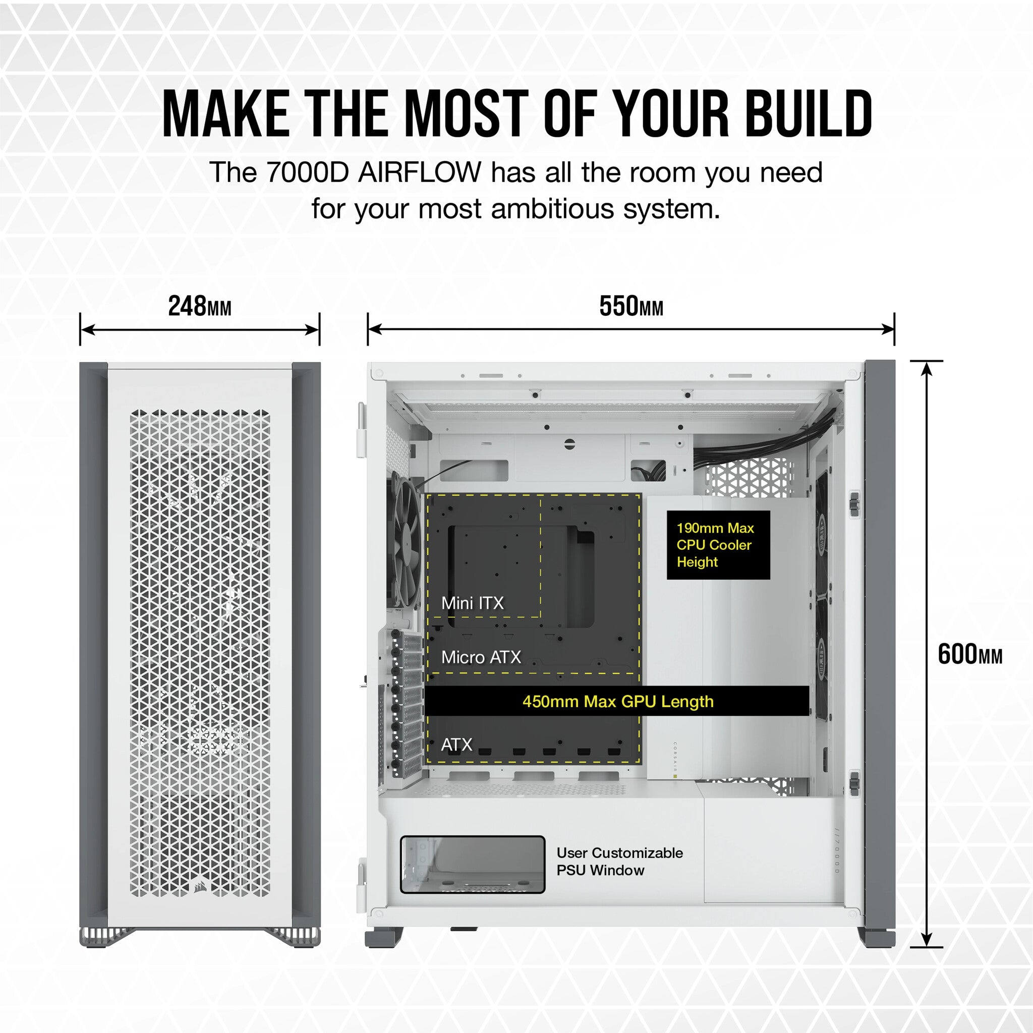 The CORSAIR 7000D AIRFLOW is a full-tower ATX case for the most ambitious builds, offering incredible cooling potential with an airflow- optimized steel front panel, hidden cable management, and three included CORSAIR AirGuide fans.
