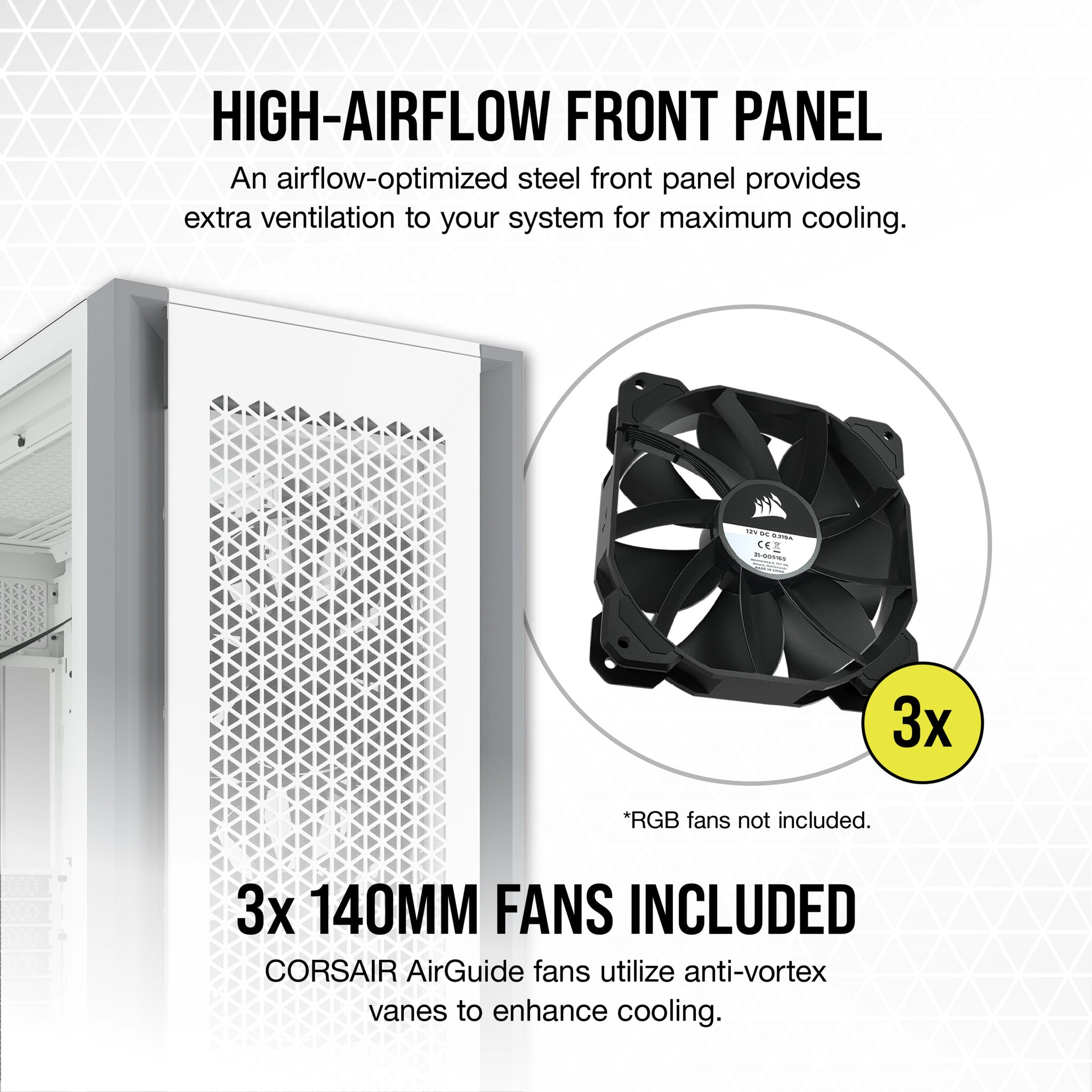 Equipped with three included CORSAIR 140mm AirGuide fans with anti-vortex vanes for concentrated airflow.