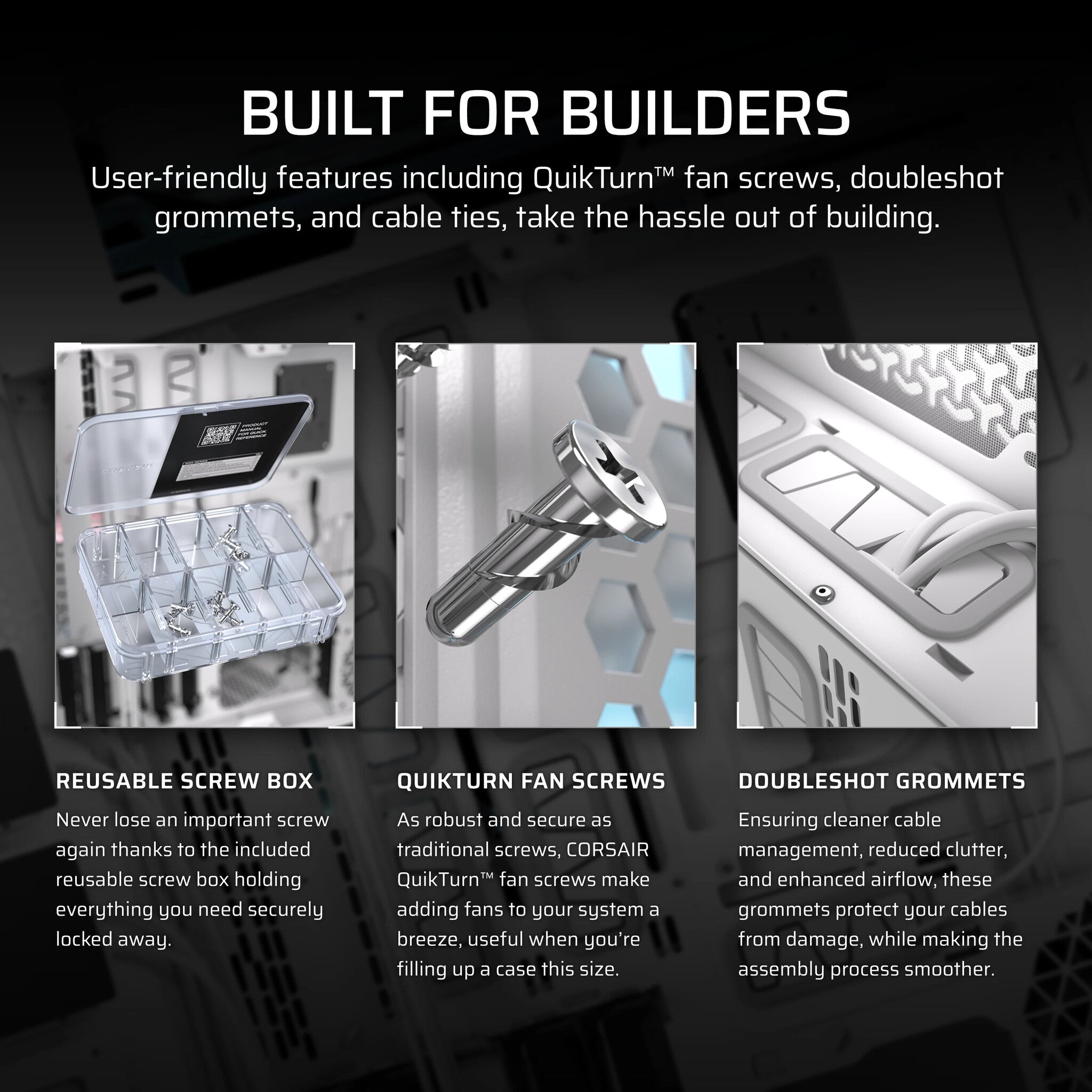 As robust and secure as traditional screws, CORSAIR QuikTurn™ fan screws make adding fans to your system a breeze, useful when you’re filling up a case this size.