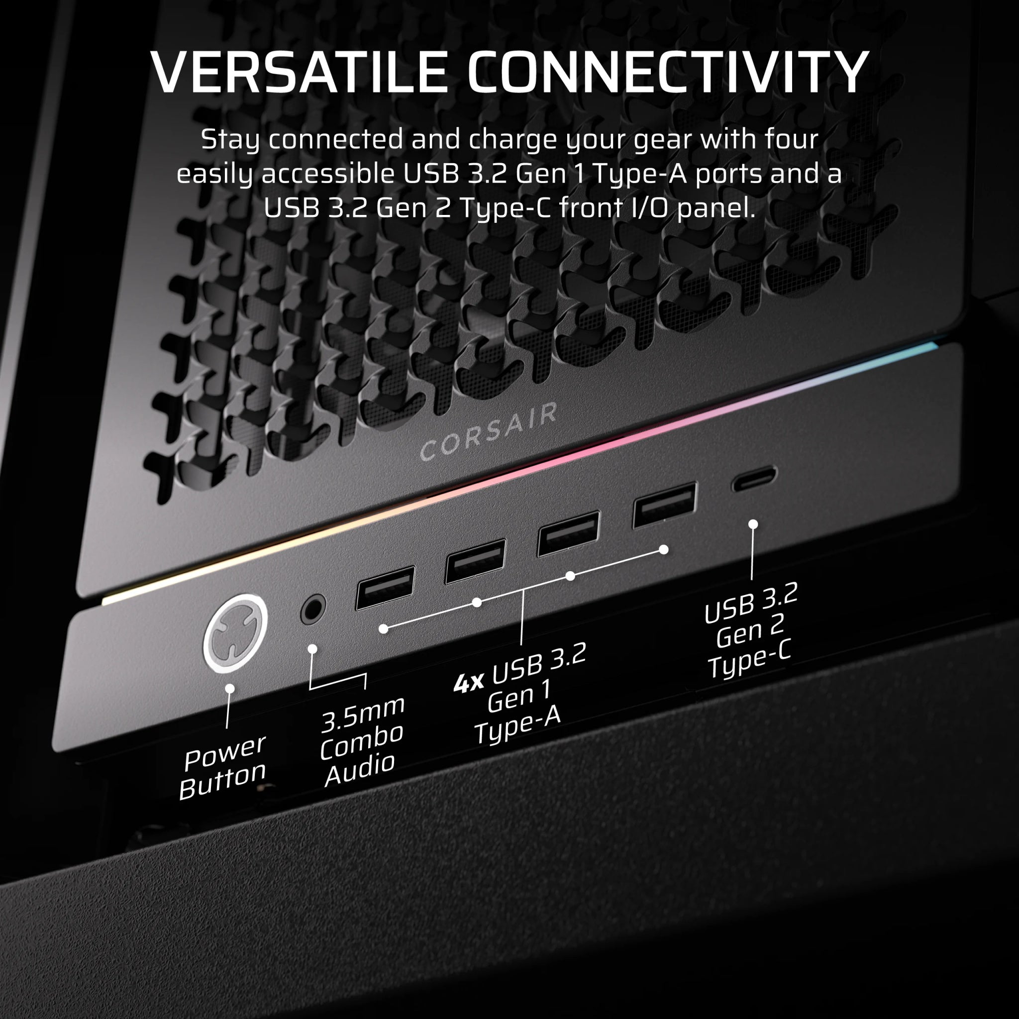 Puts your connections within easy reach, including a USB 3.2 Gen 2 Type-C Port, 4x USB 3.2 Gen 1 Type-A ports, and a combination audio/microphone jack.