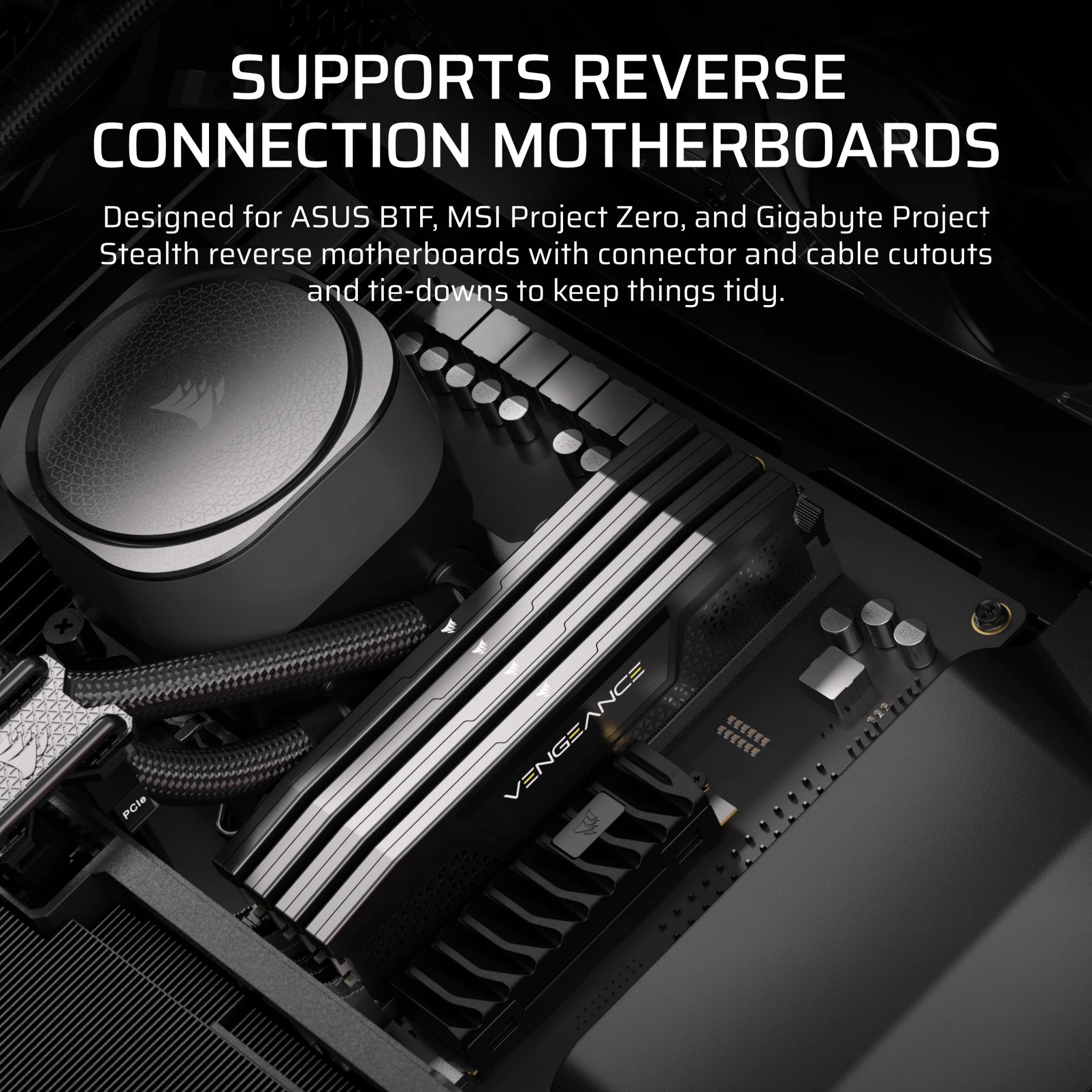 Fully compatible with reverse-connector motherboards from Asus, MSI, and Gigabyte, allowing for unobstructed airflow and a super-clean build.