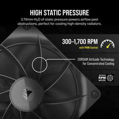 CORSAIR RX140 PWM fans push through obstructions using high static pressure and PWM controlled speeds, built with premium Liquid Crystal Polymer and CORSAIR AirGuide technology.
