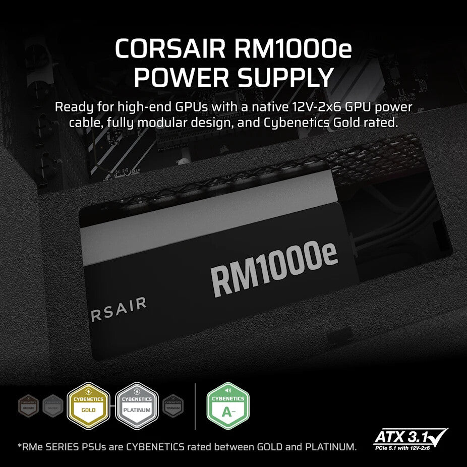 CORSAIR RMe Series Fully Modular Low-Noise Power Supplies include a dedicated 12V-2x6 GPU power cable, ATX 3.1 certification and PCIe 5.1 compliance, and Cybenetics™ Gold rated efficiency for a quiet, reliable build. The RMe PSUs' compact size also allow for easier cable management.