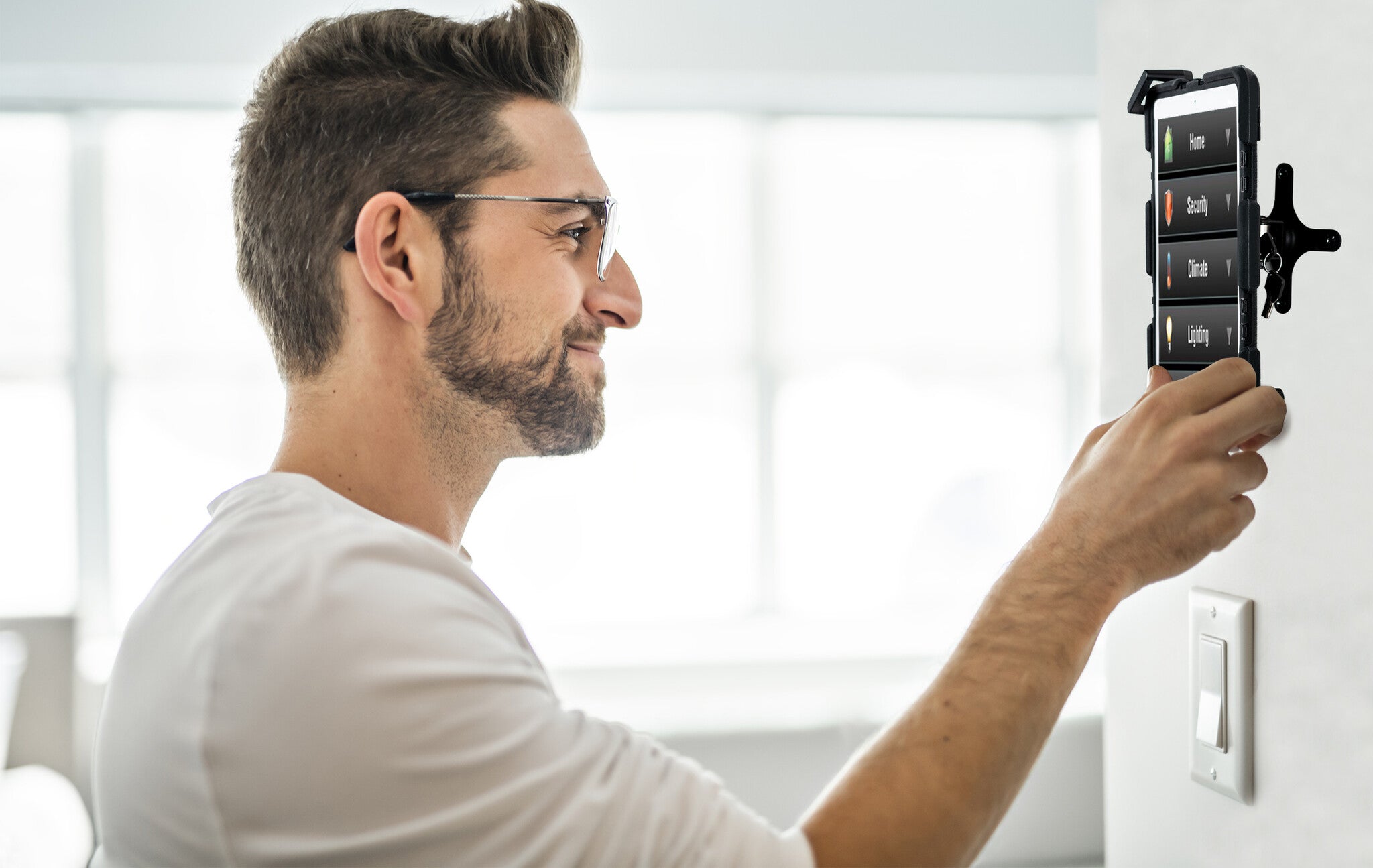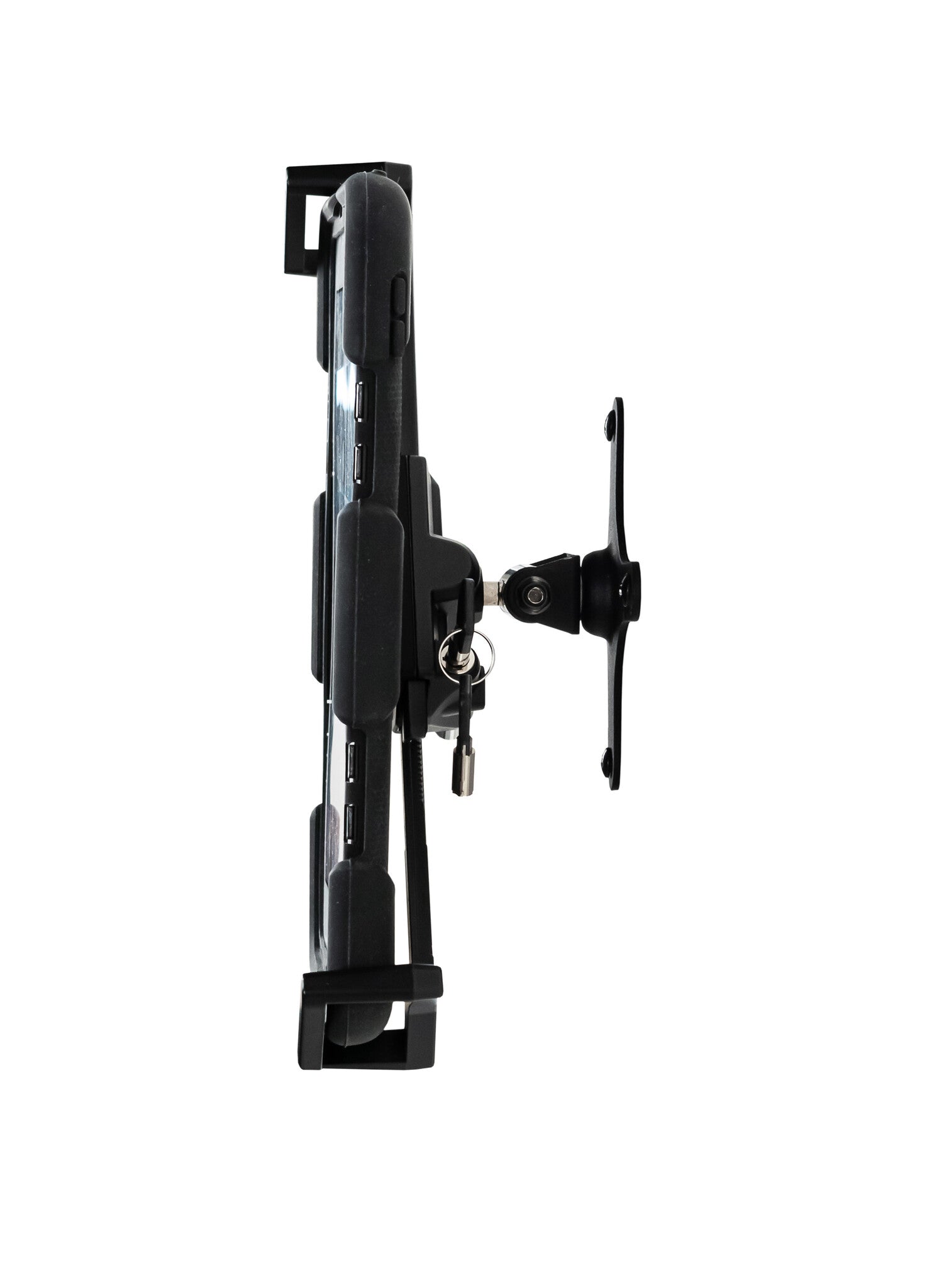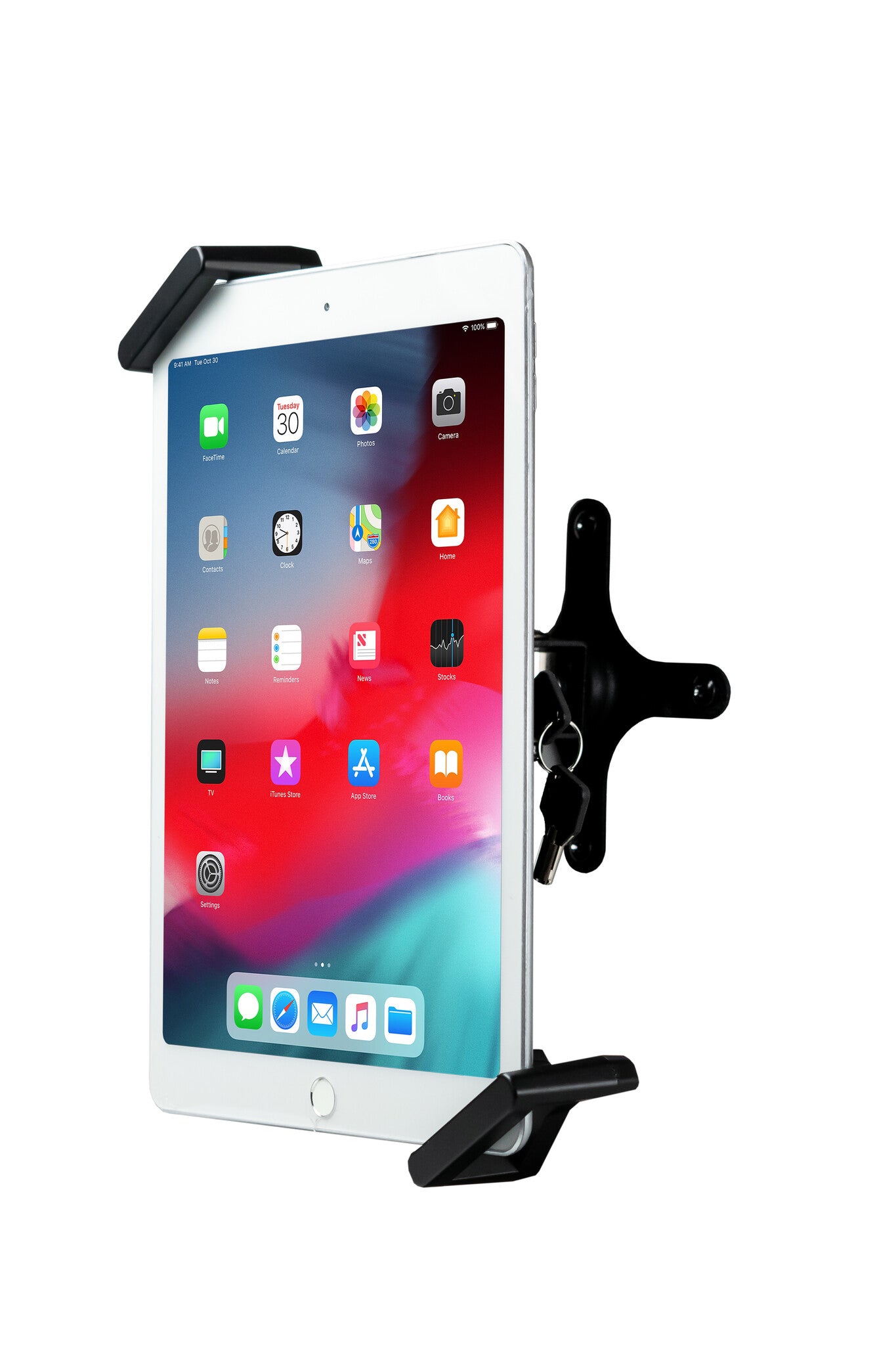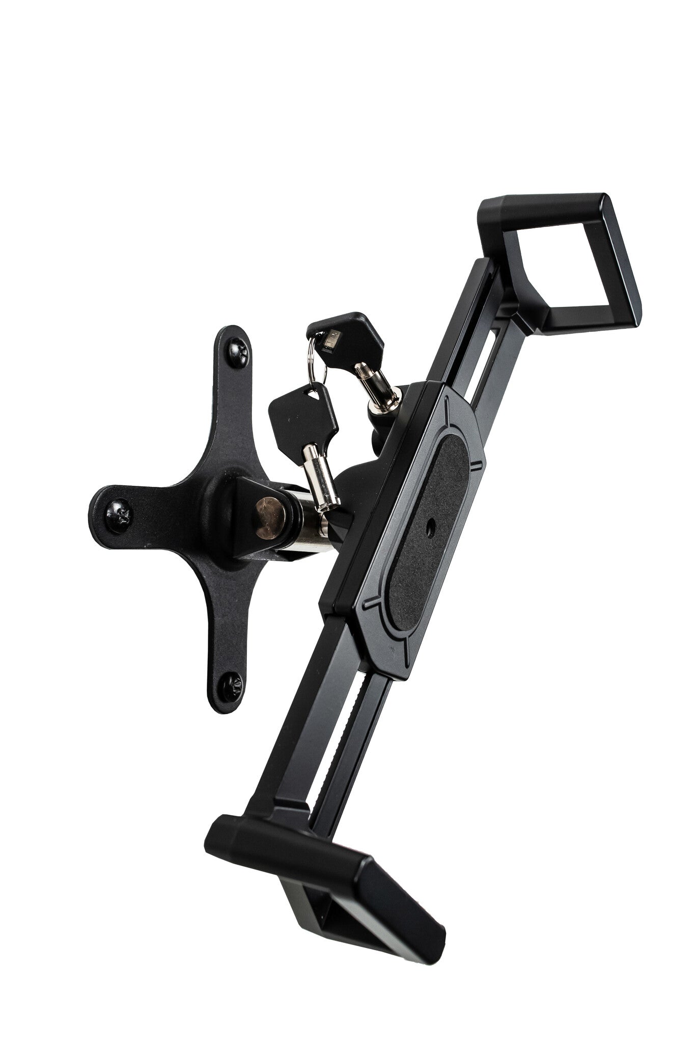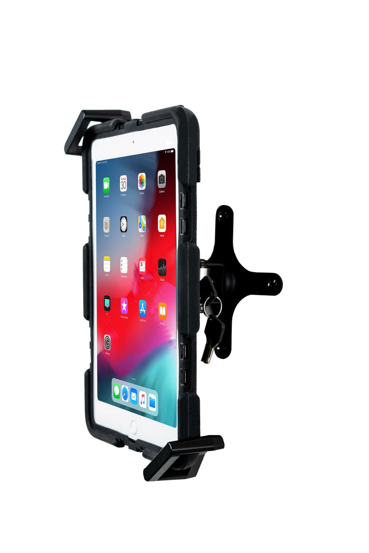 With clean functionality, sturdy engineering, and a minimalist design, the Security VESA and Wall Mount provides a space-saving, adjustable, and no-nonsense way to secure your tablet to a wall or surface in your office, sales showroom, classroom, or home. The stylish diagonal grip allows easy access to all plugs, headphone jacks, ports, or credit card readers. A convenient and powerful lock and key system prevents theft – nobody can walk away with your tablet without taking your entire wall with them. The adjustable grip and exchangeable foam pads allow this universal wall mount to hold any device you want, with or without a protective case. The sturdy, adjustable arm allows 360 degrees of rotation to allow portrait or landscape orientation, and 30 degrees of tilt means you can avoid glare or awkward angles. The efficiently designed arm holds the device a snug 3-inches away from the wall or surface it’s fixed to. Also included are screws, expansion bolts, and keys