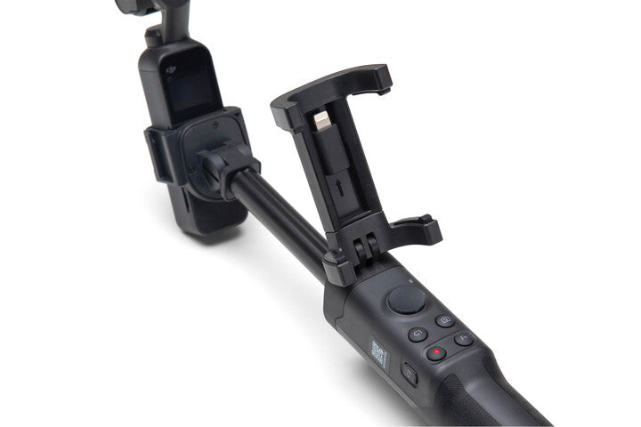 You can attach your phone to the phone holder, and use an Osmo Pocket Wireless Module (sold independently) to control Osmo Pocket with the extension rod. The extension rod also features multiple mounting brackets for additional shooting options.